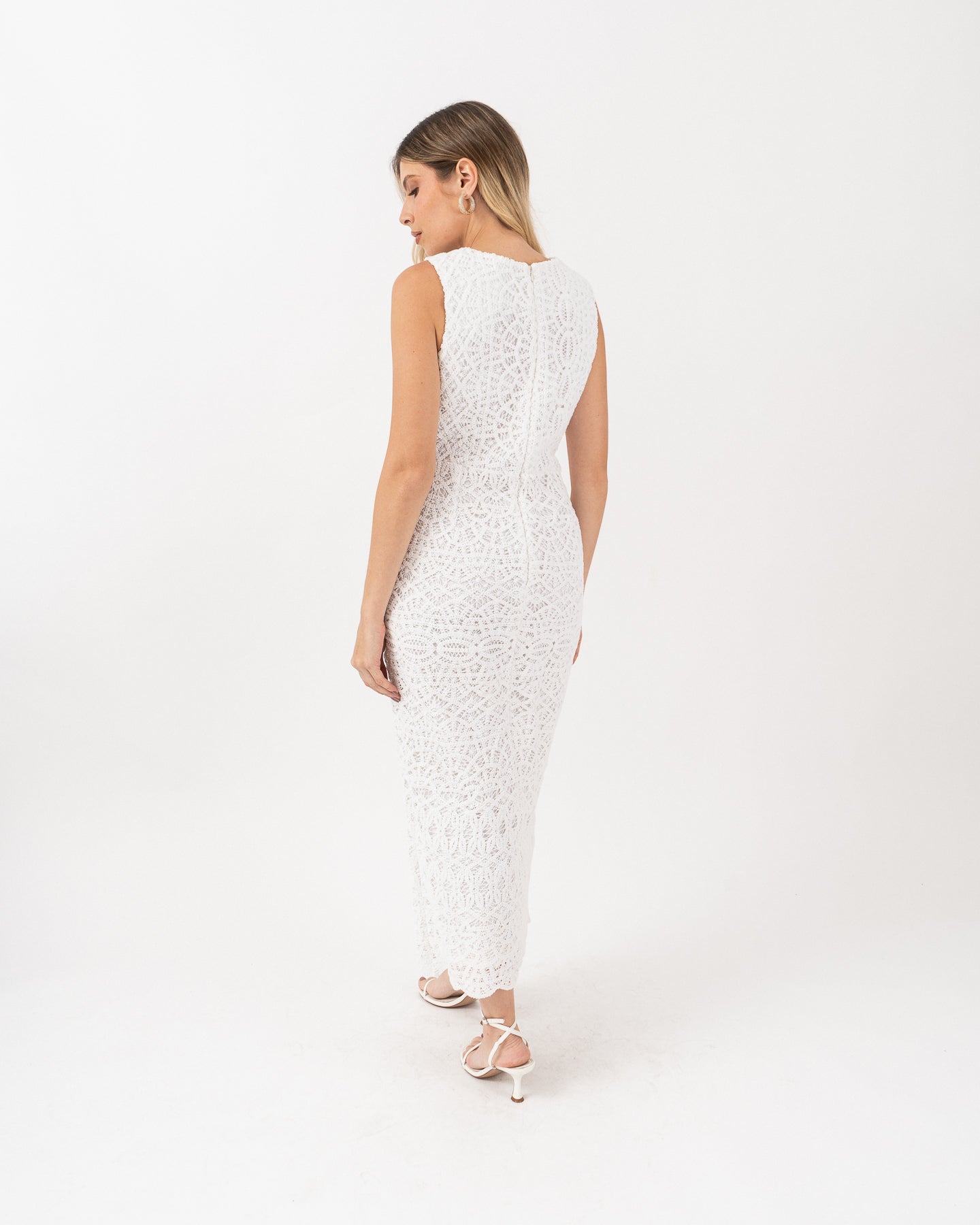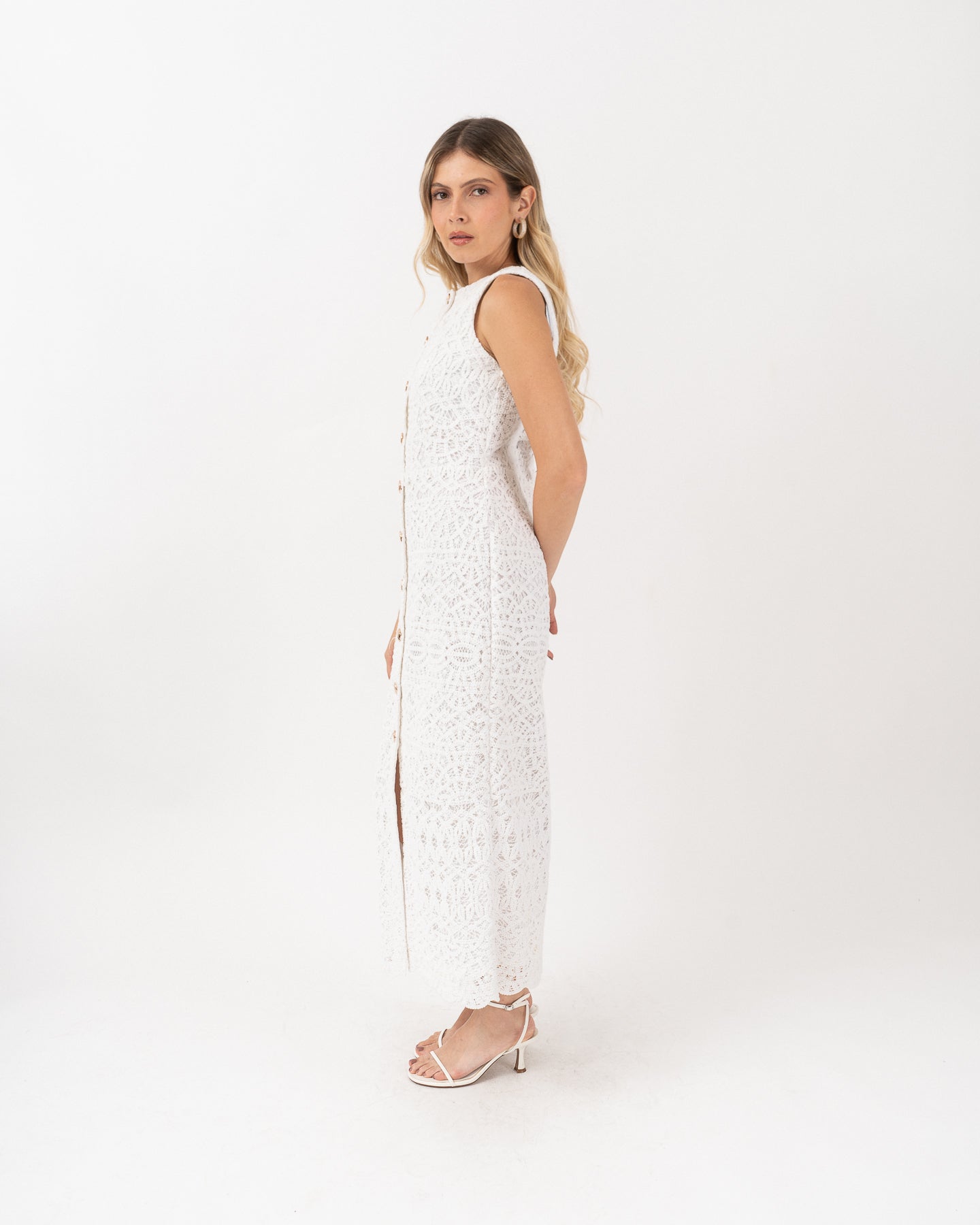 Lined dress with sleeveless sleeves and a round neckline with gold buttons in the center of a decorative pocket.