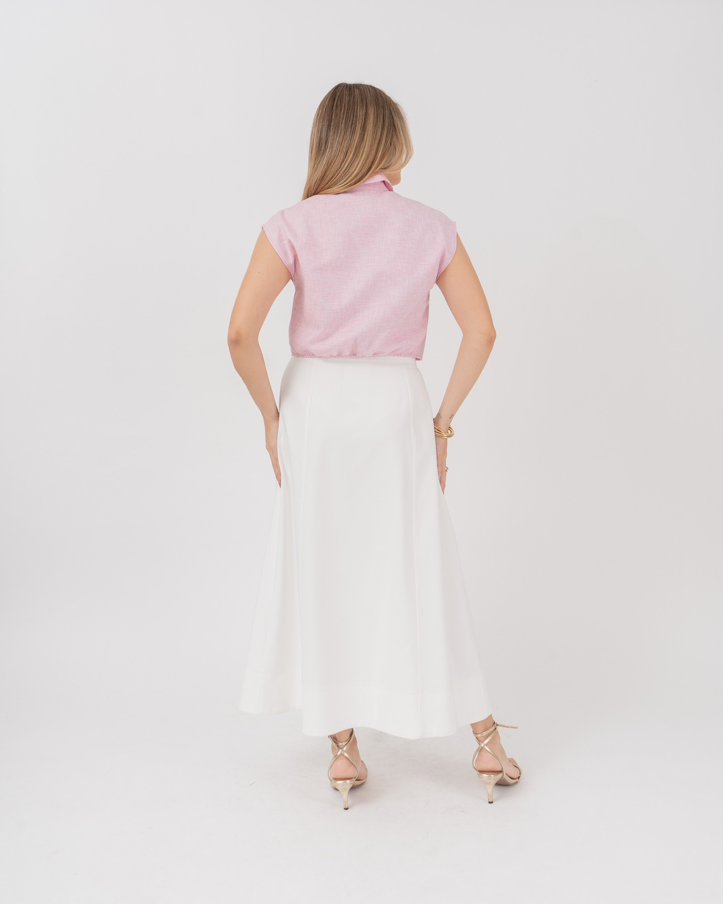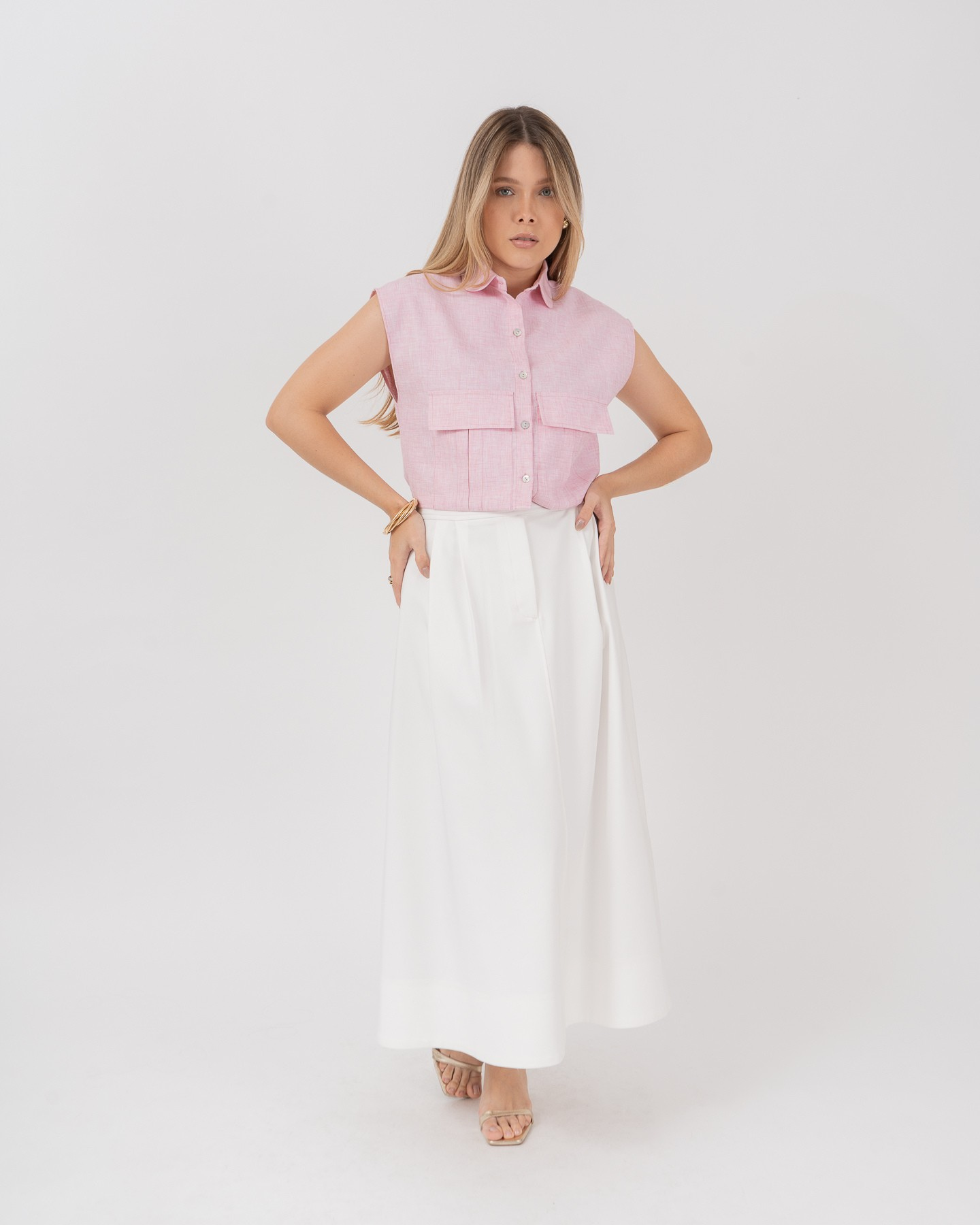 Blusa corta cuello camisero de manga sisa con detalle de grandes bolsillos en bajo