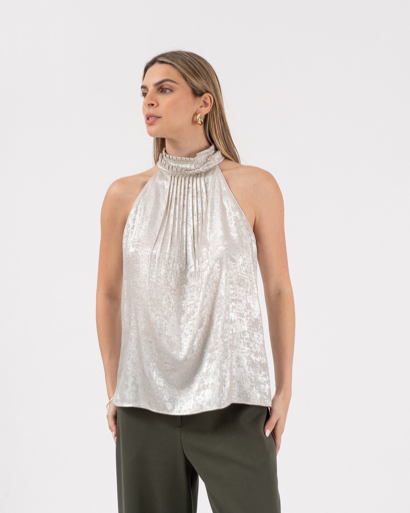 Blusa cuello halter con detalle de plisados en contorno, cierre posterior con botones plata, recogido en centro delantero para dar amplitud.