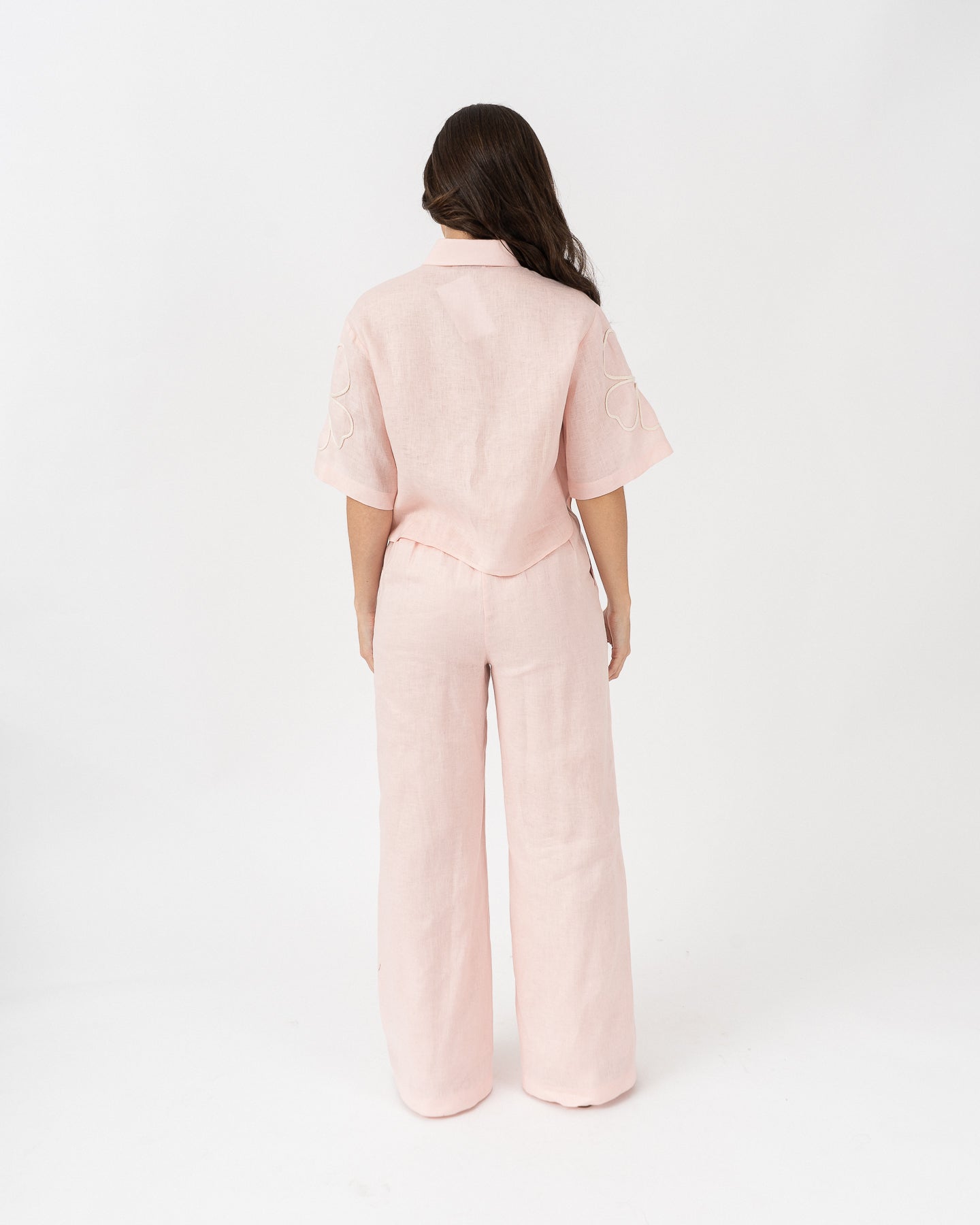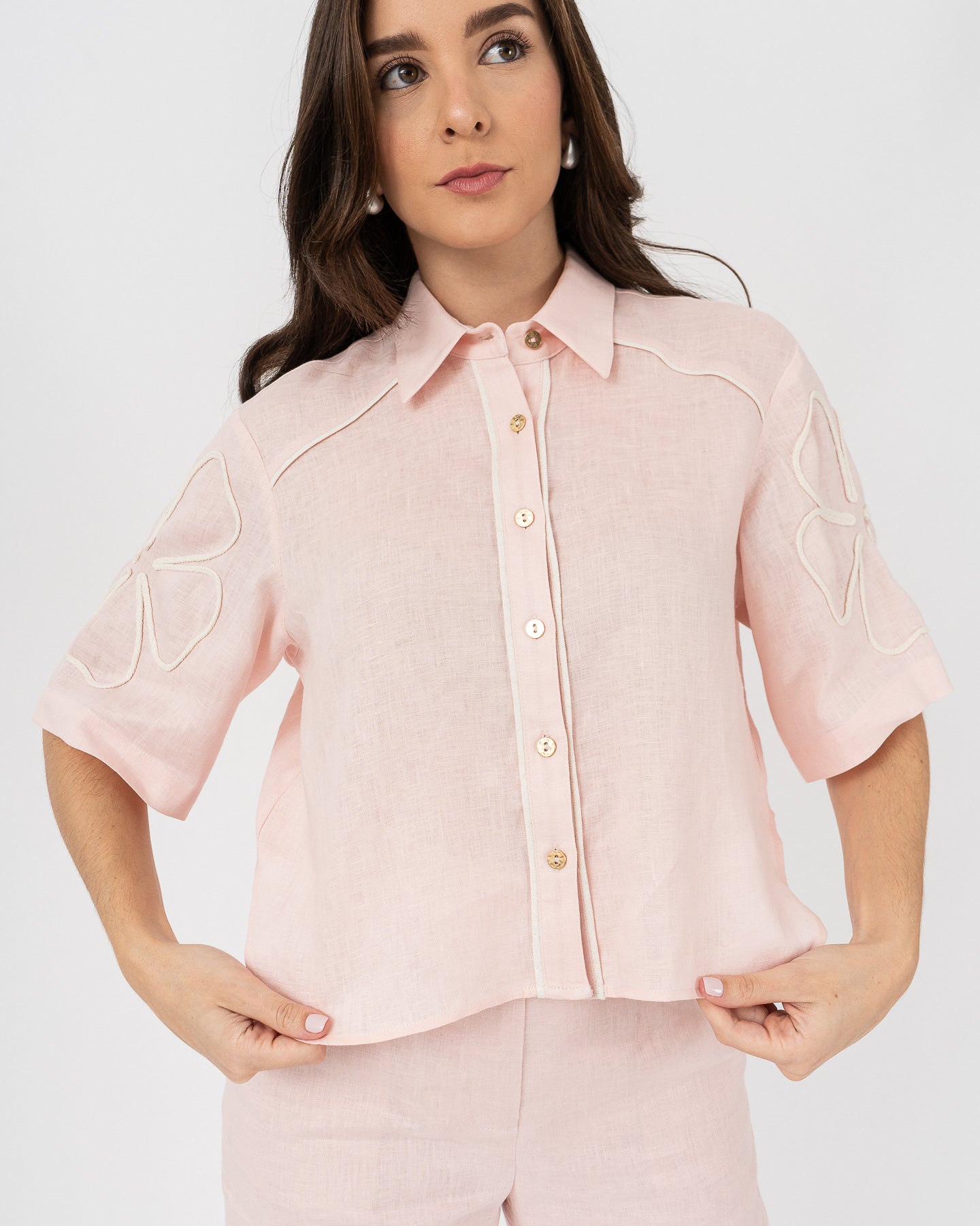 Blouse with a shirt collar and curved hems. Embroidered flower detailing on the sleeve centers with matching shoulder padding. Front closure with gold buttons.