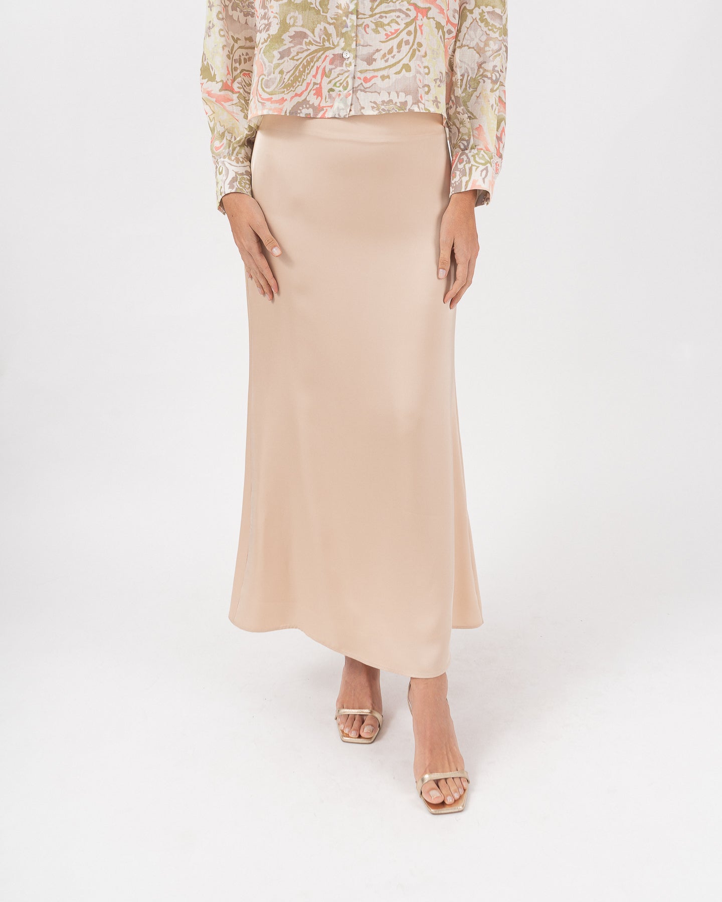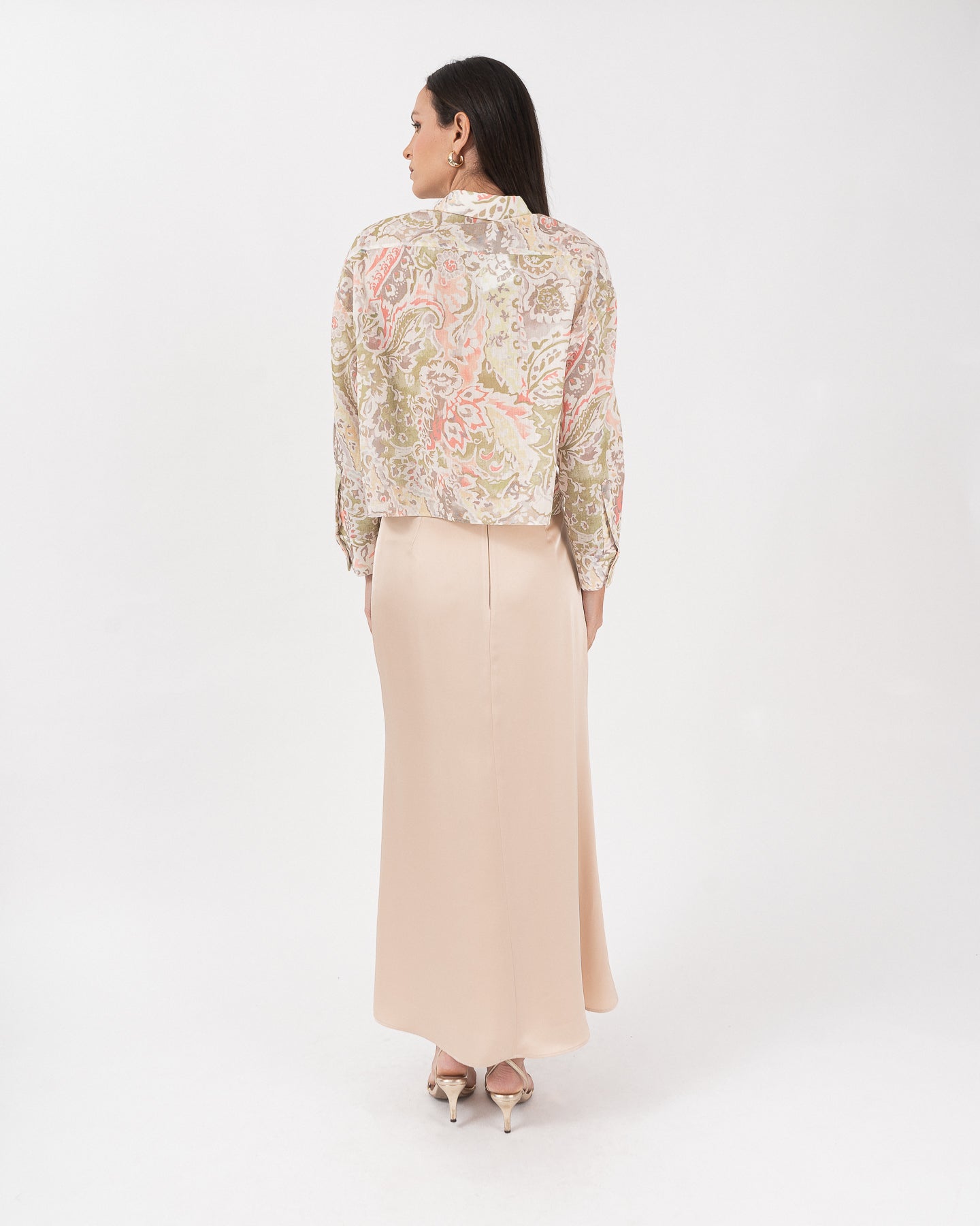 Falda forrada con pretina invisible, cierre funcional en centro posterior.