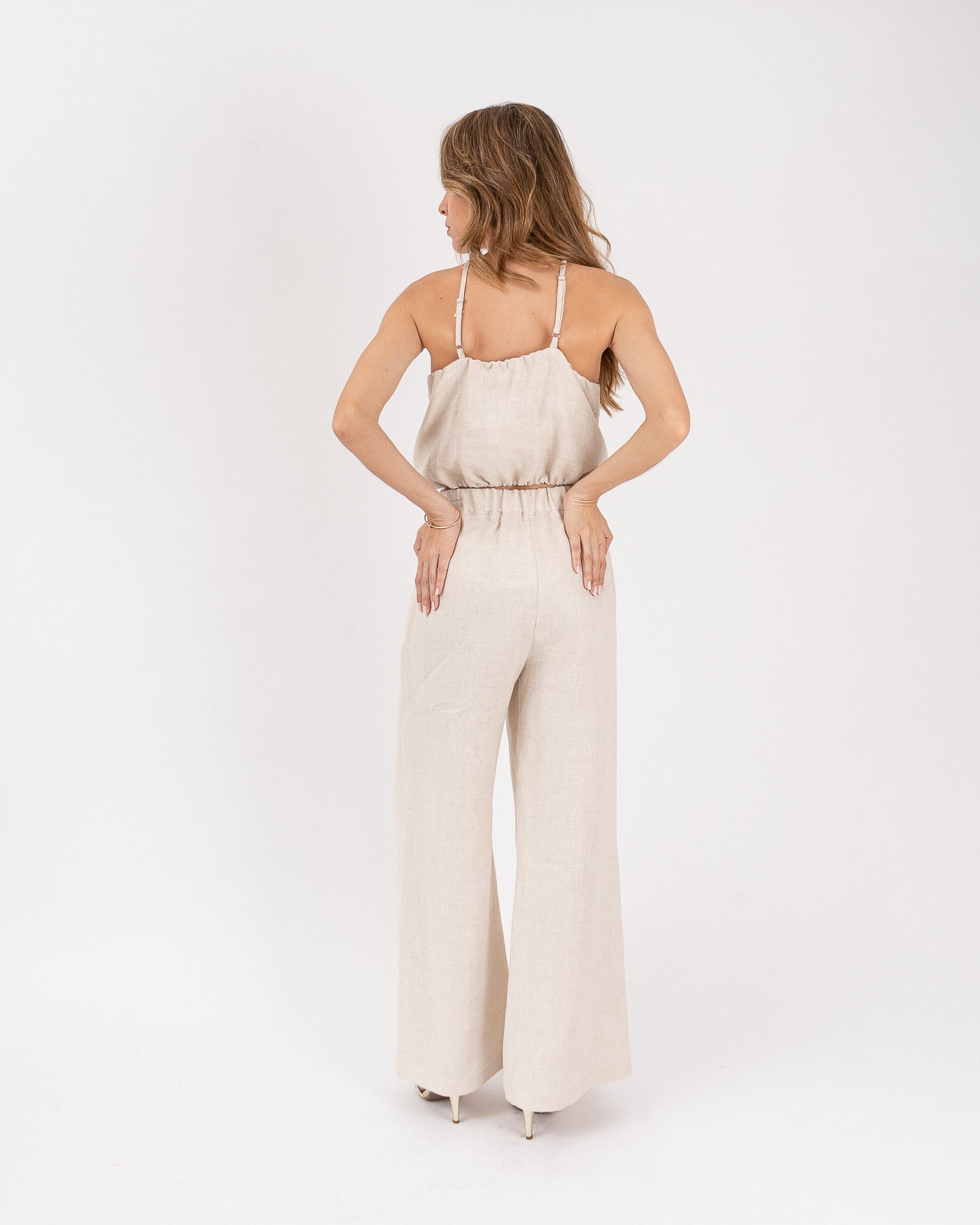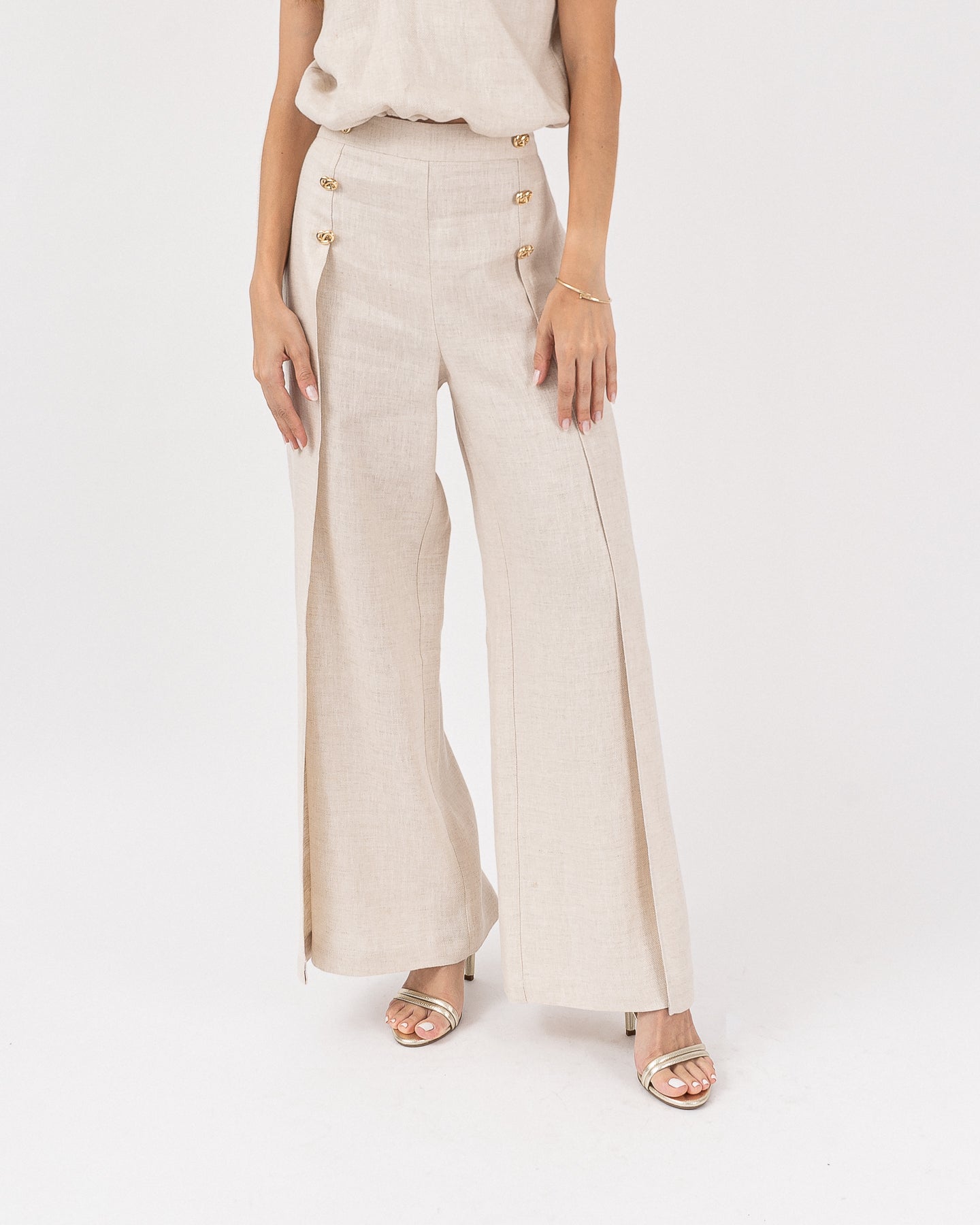 Pantalón de tiro alto con pretina y cierre invisible en costado izquierdo, botones decorativos dorados sobre festón en centro de piernas.
