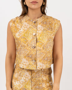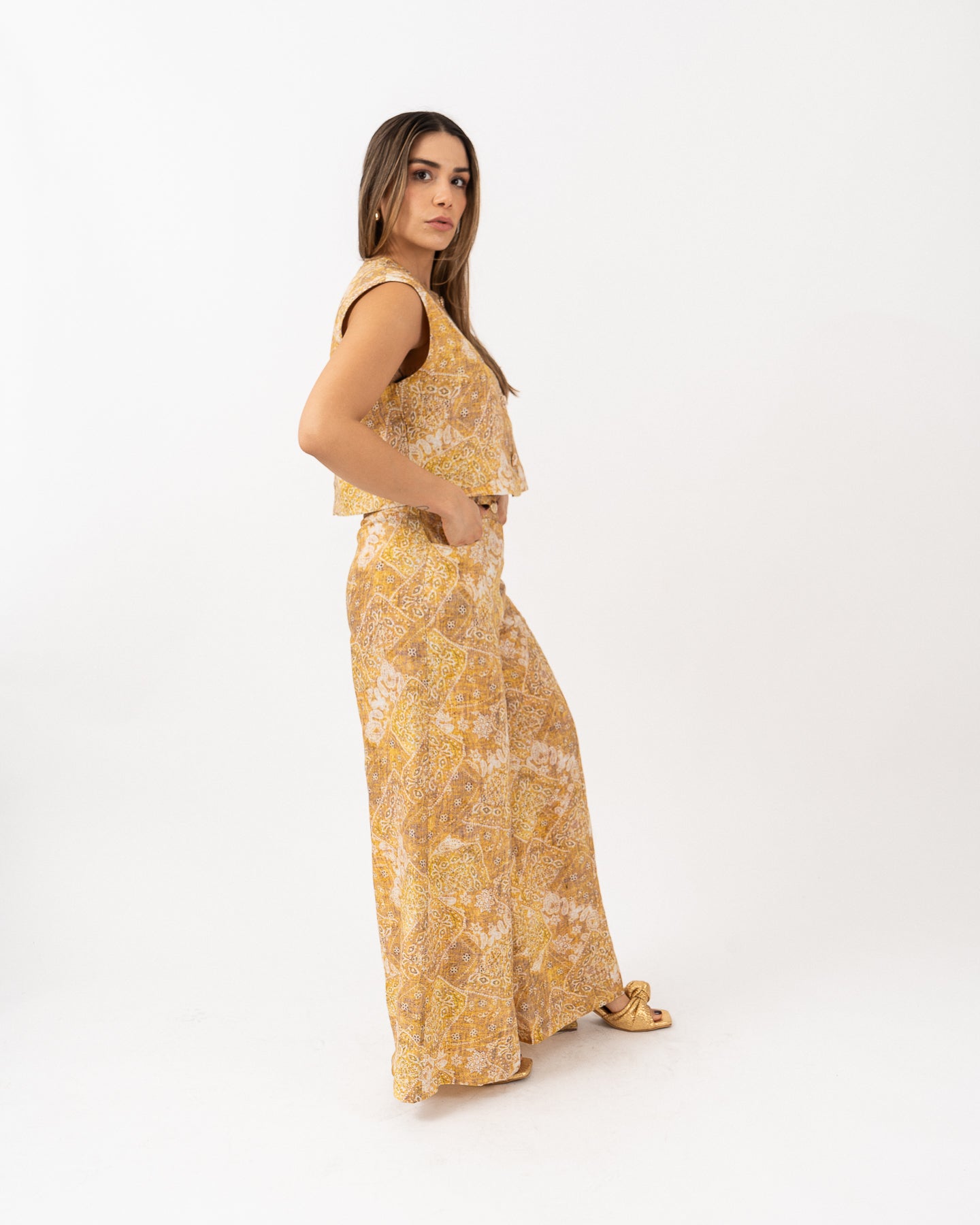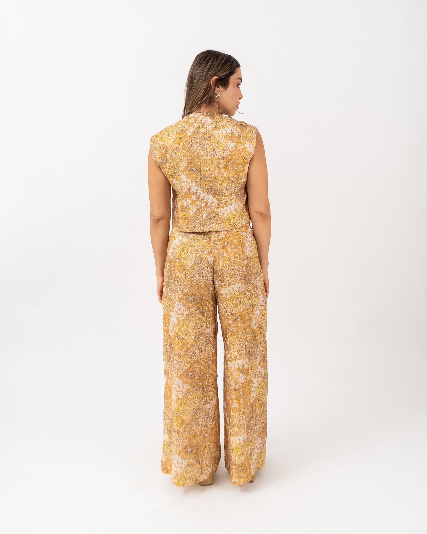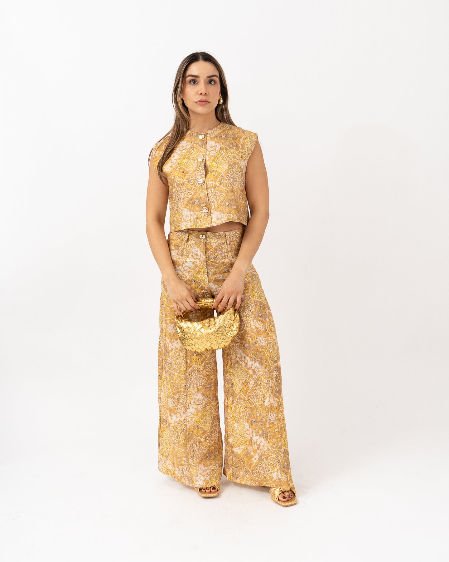 High-waisted trousers with a functional waistband and gold button, side pockets, and slits for added width at the center front.