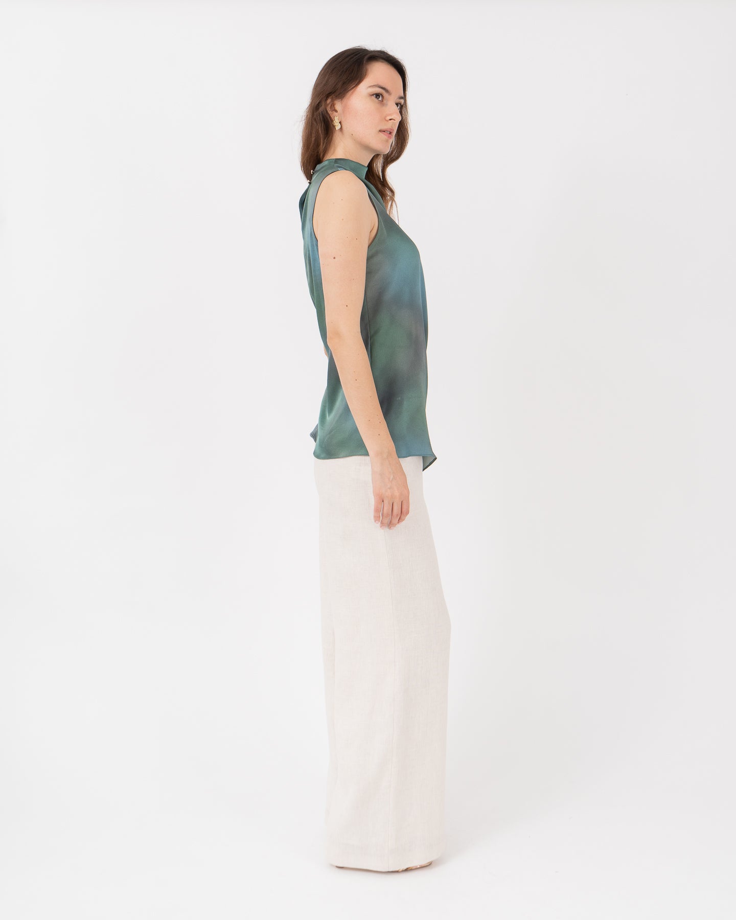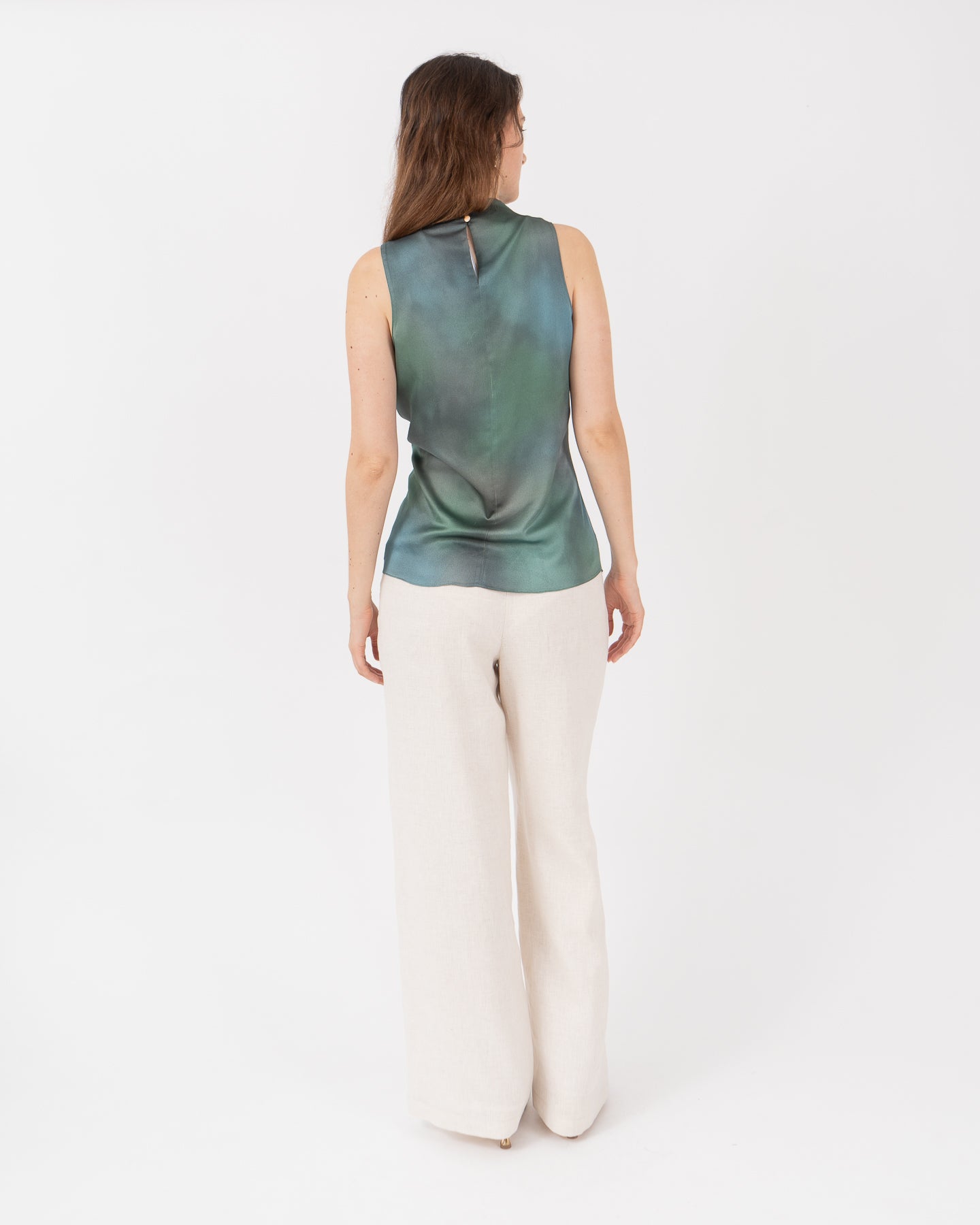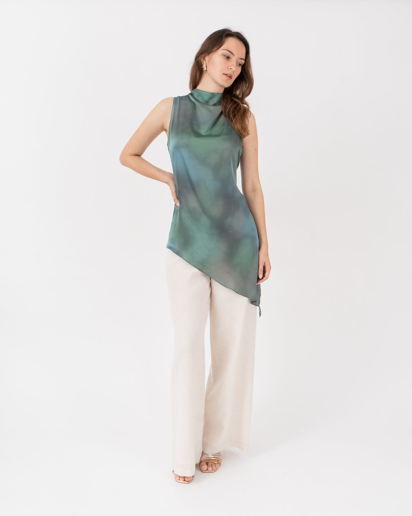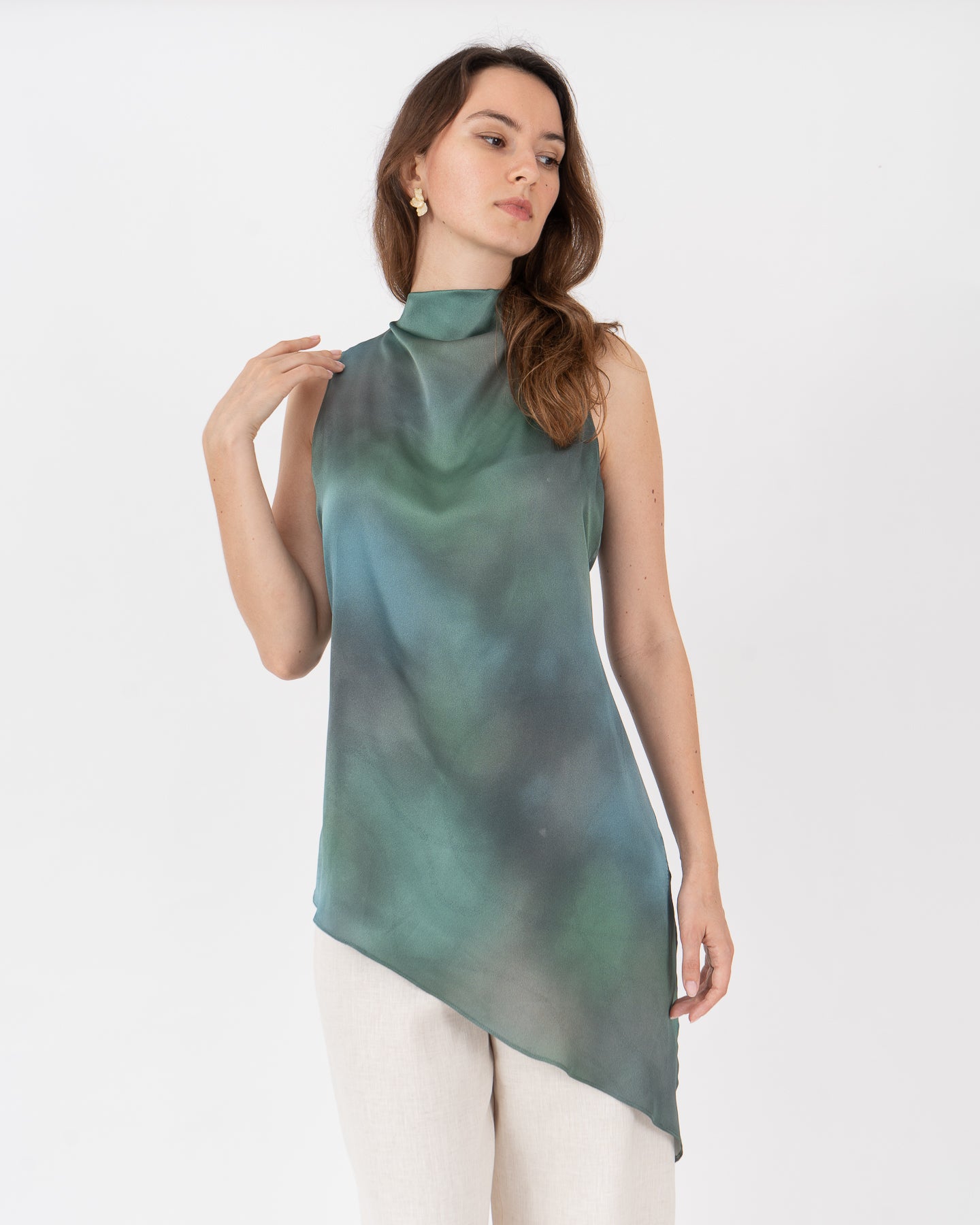Blusa asimétrica de cuello alto drapeado, cierre posterior con botones dorados.
