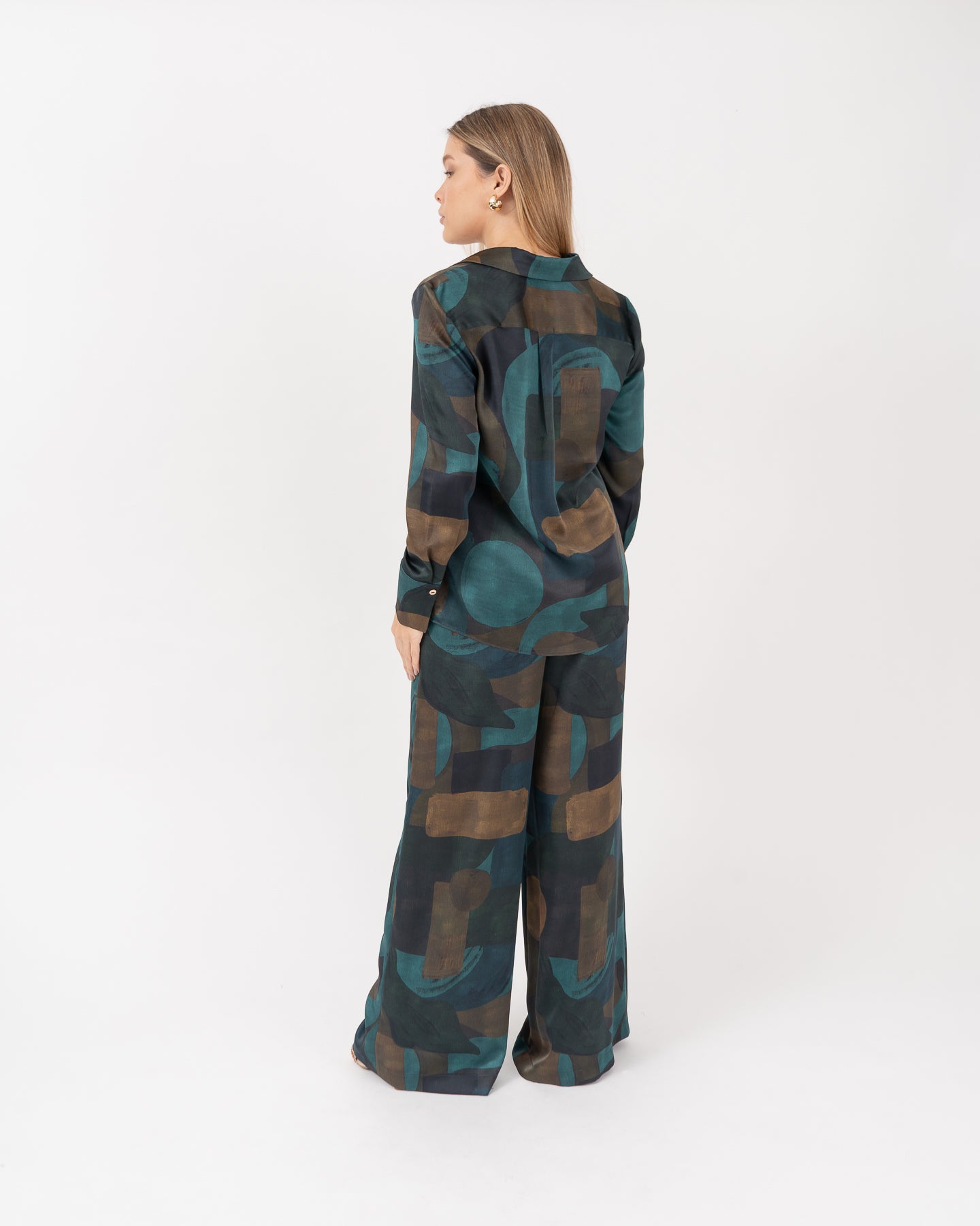 Blusa cuello camisero manga larga con aberturas en costados, centro delantero con botones dorados.