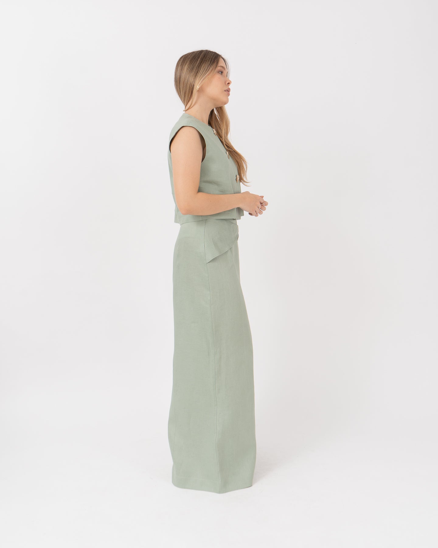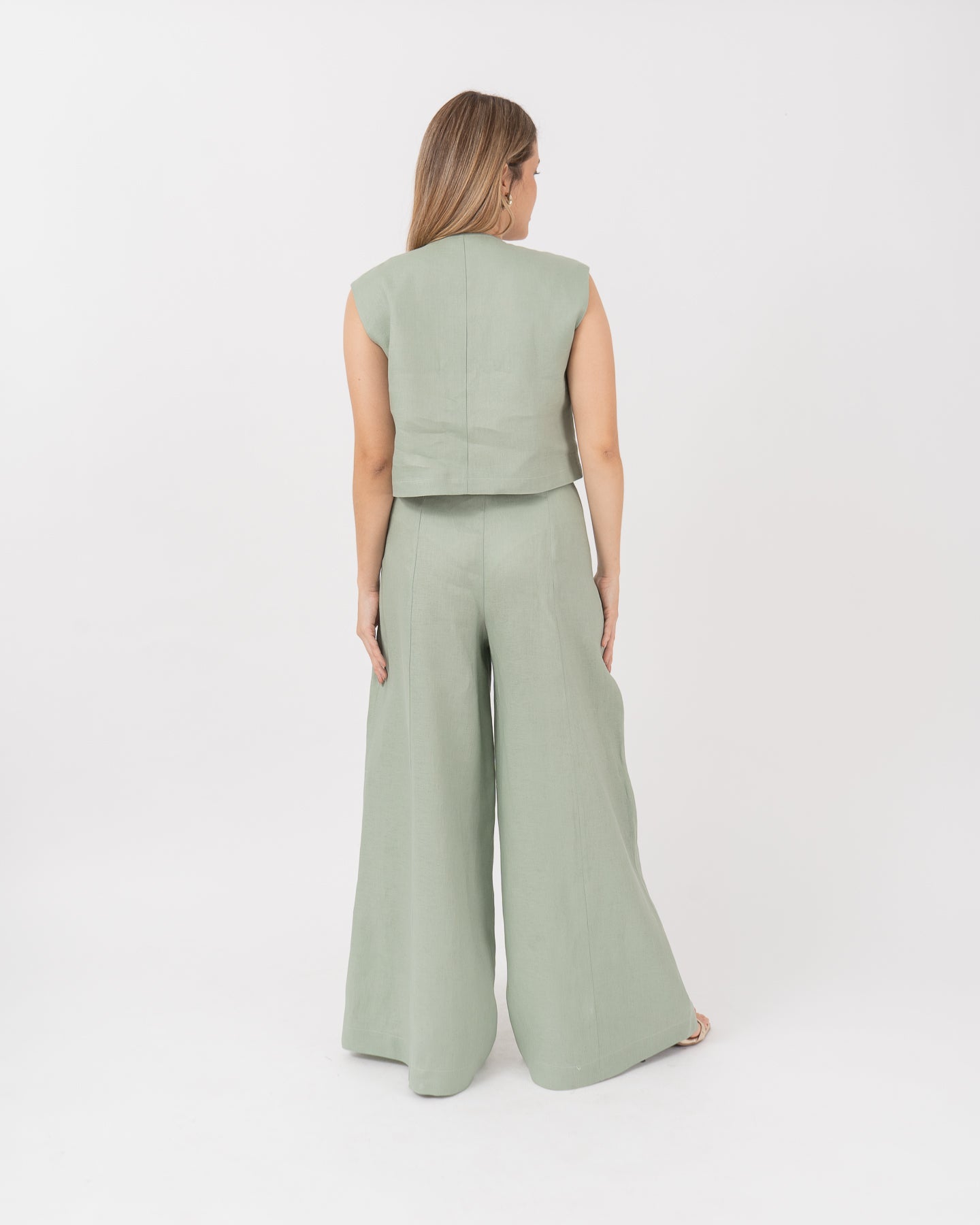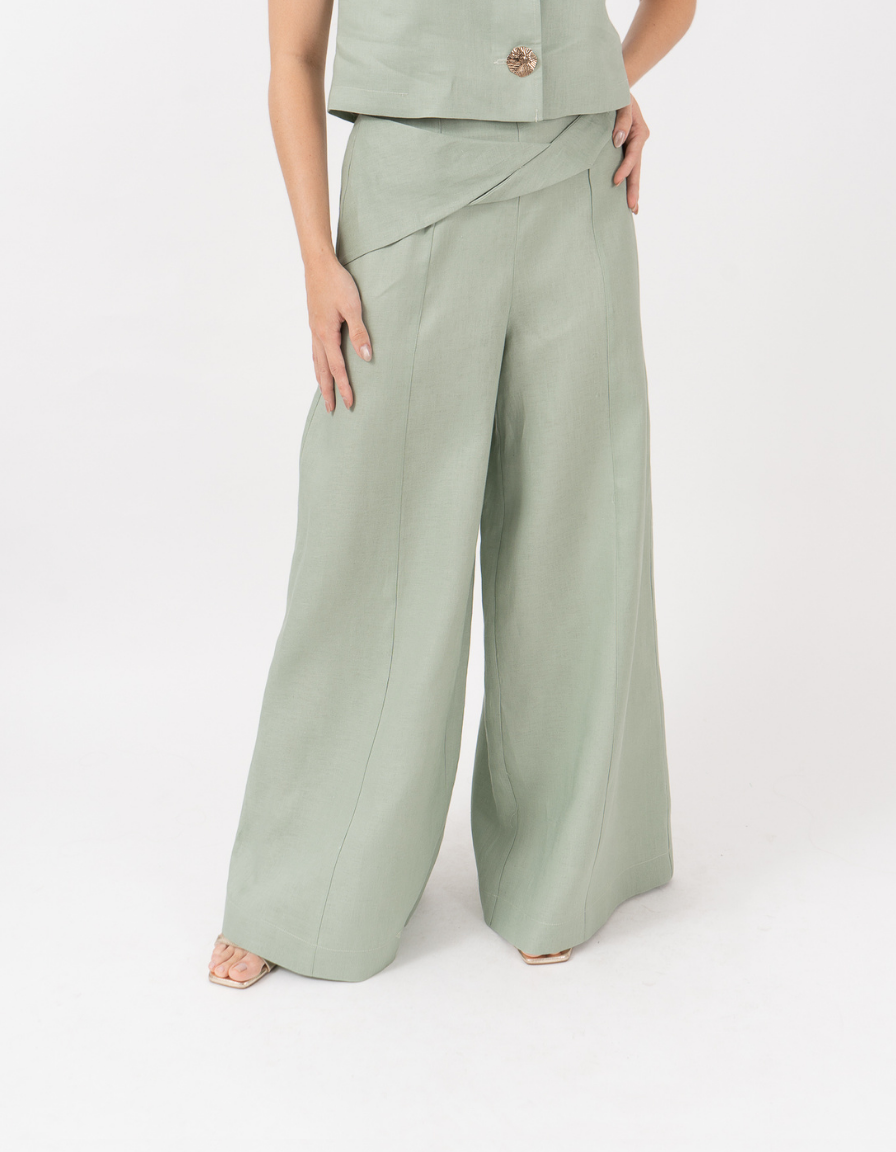 Pantalón de tiro alto bota amplia con detalle de pretina asimétrica y botón decorativo en punta.