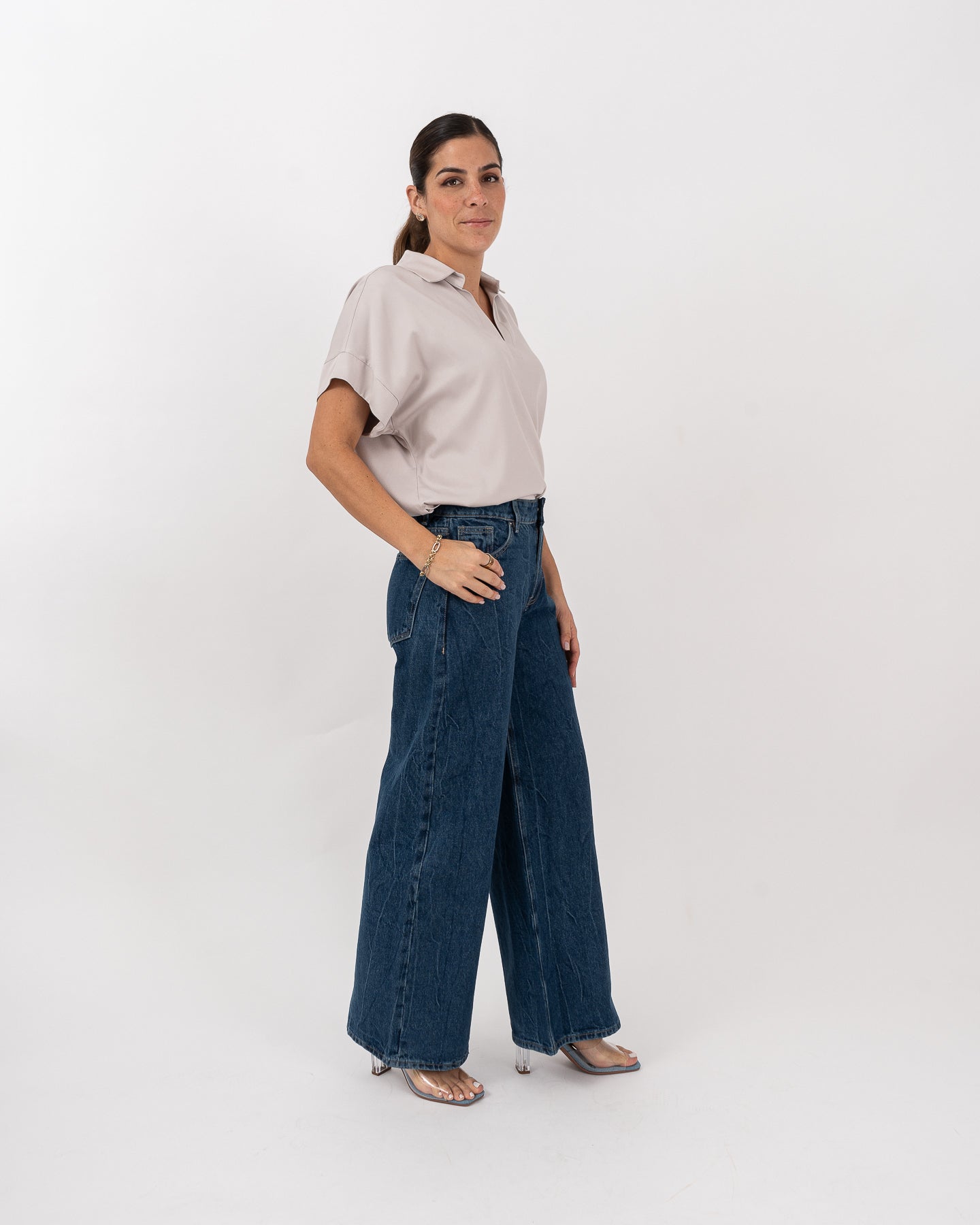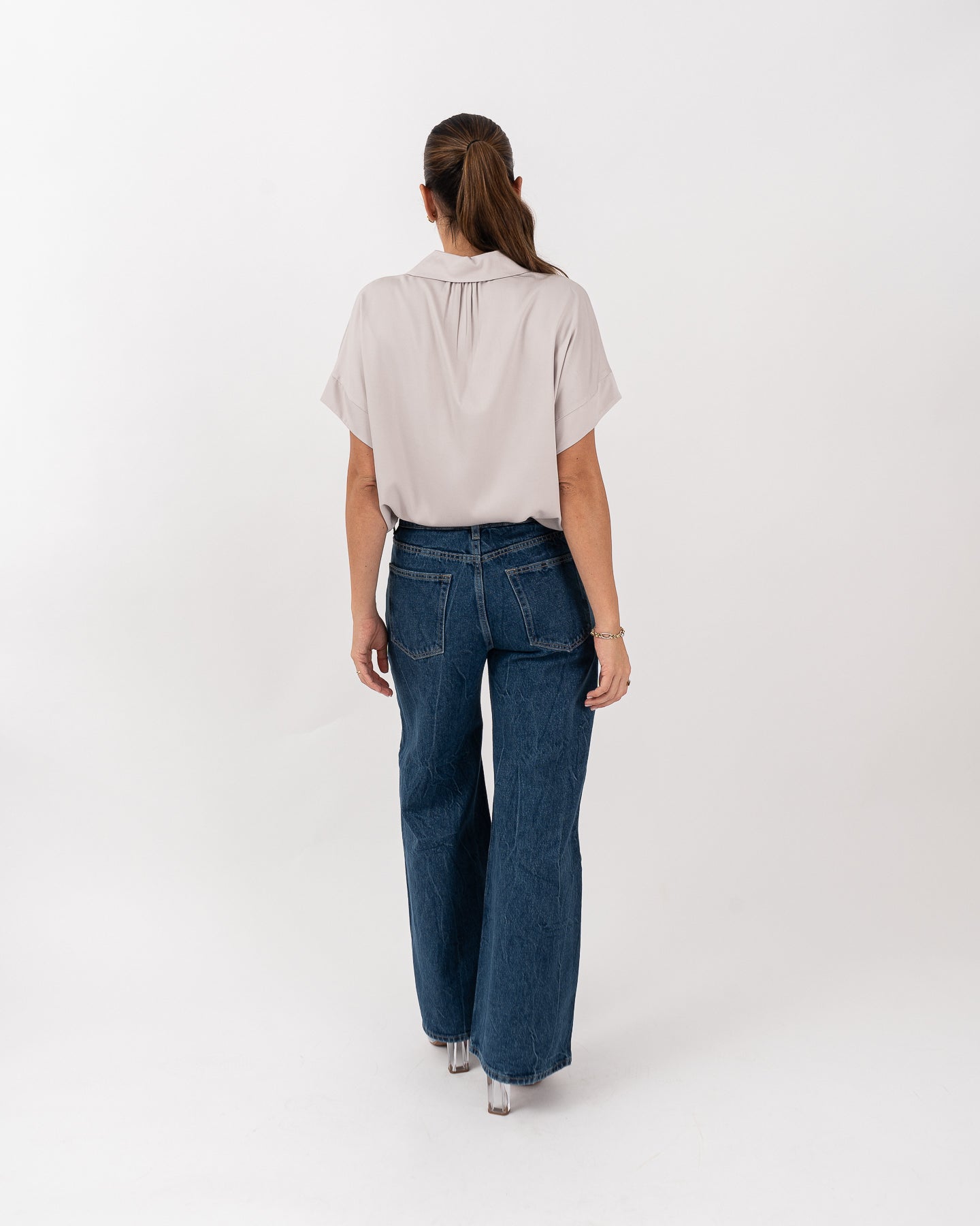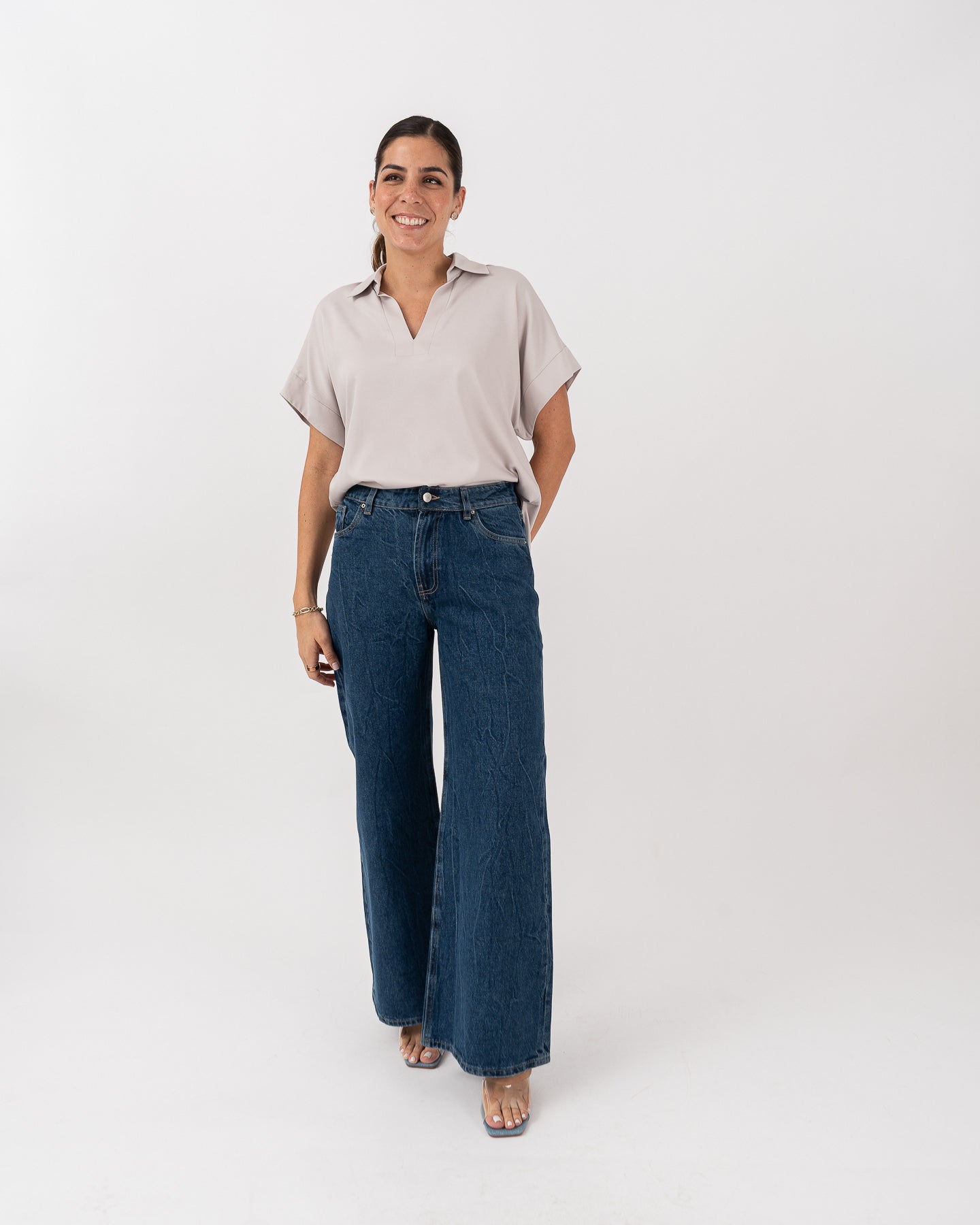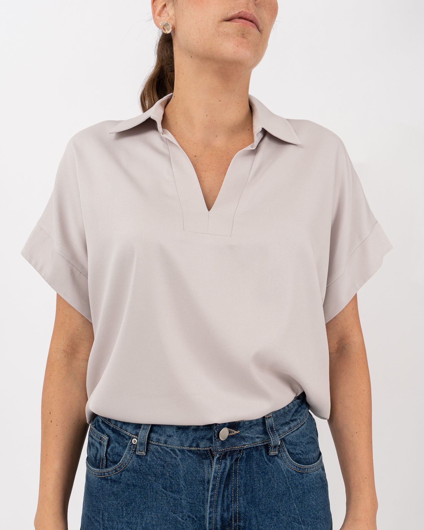 Blusa cuello camisero manga kimona con cartera tipo polo y leve recogido en escote posterior.