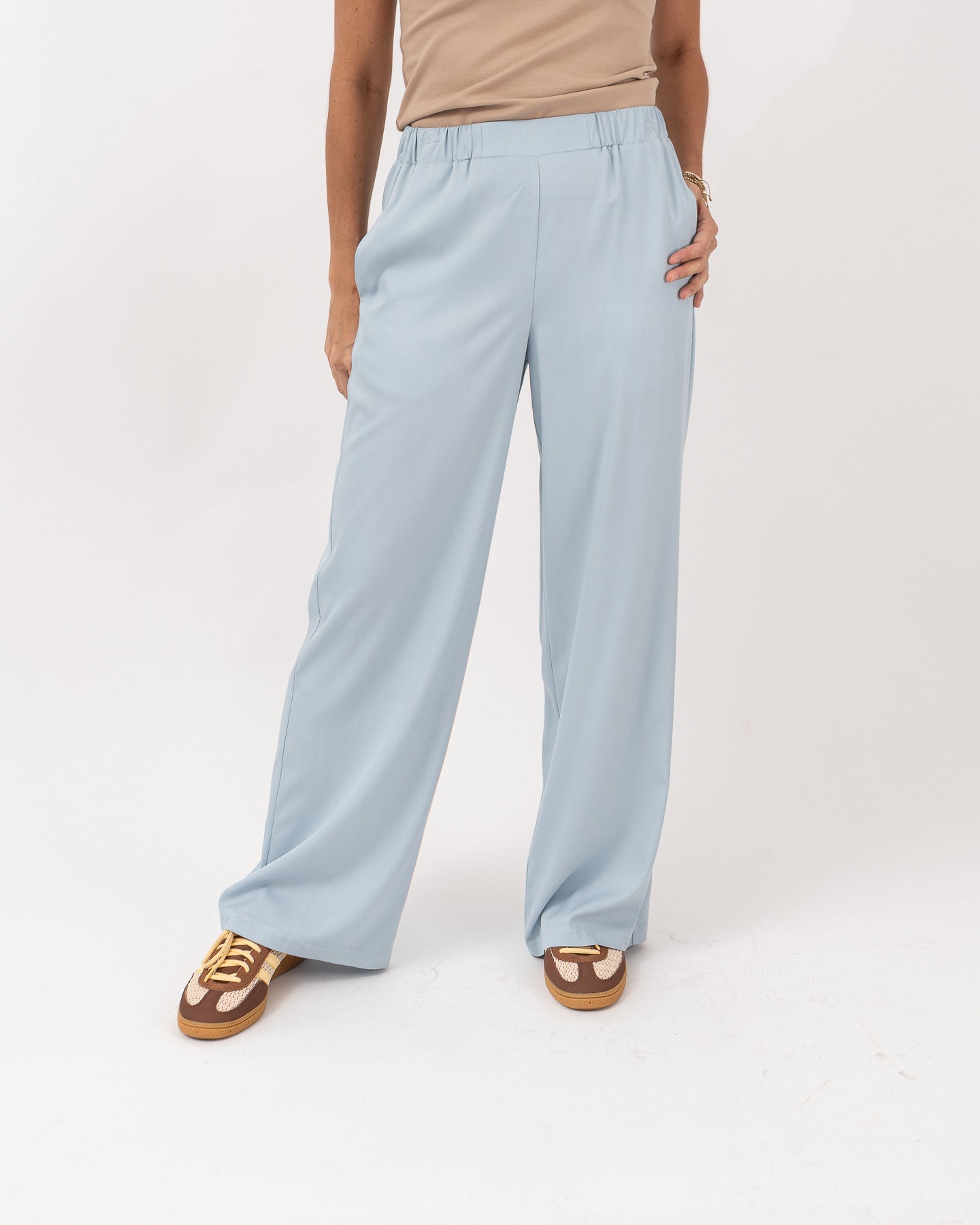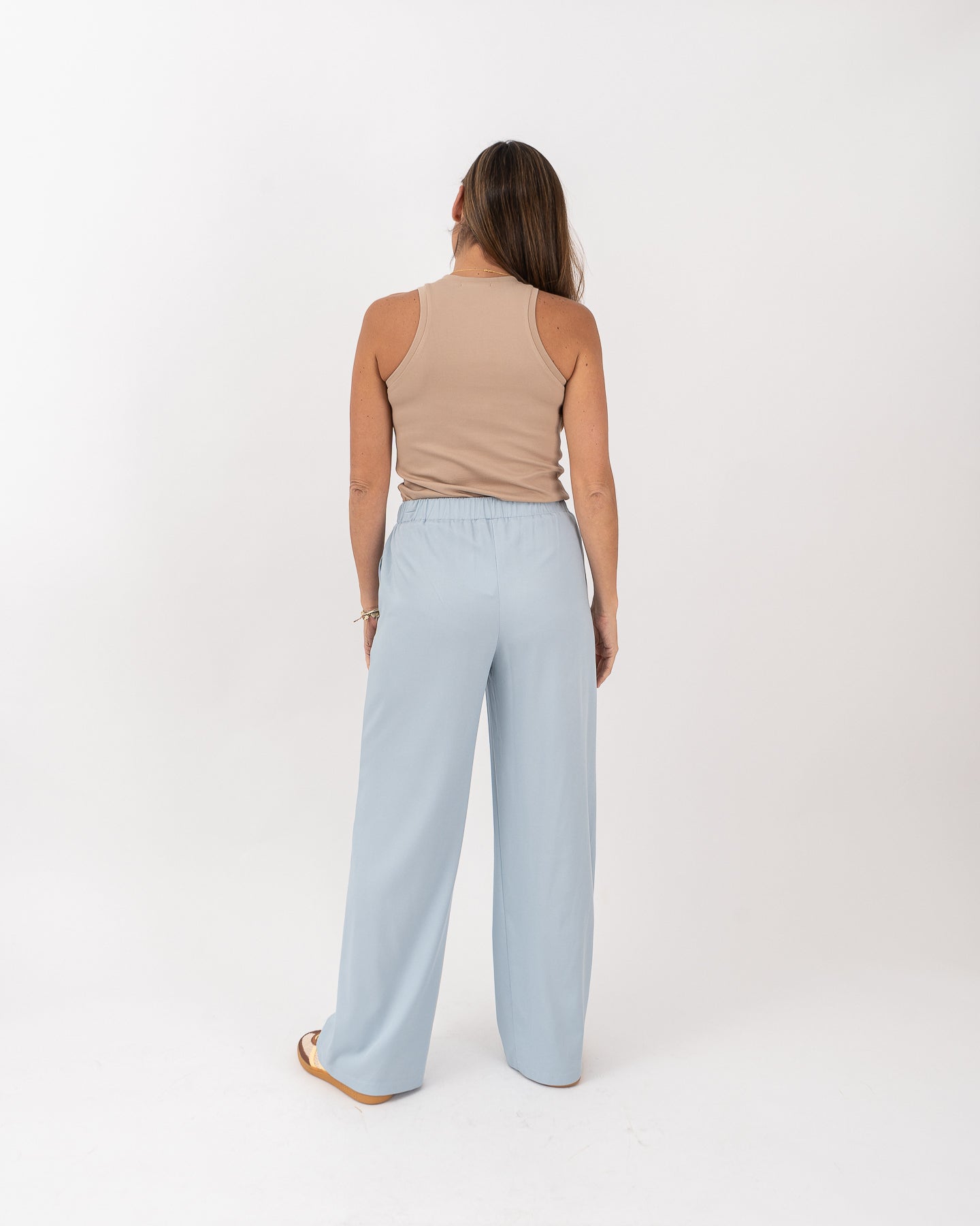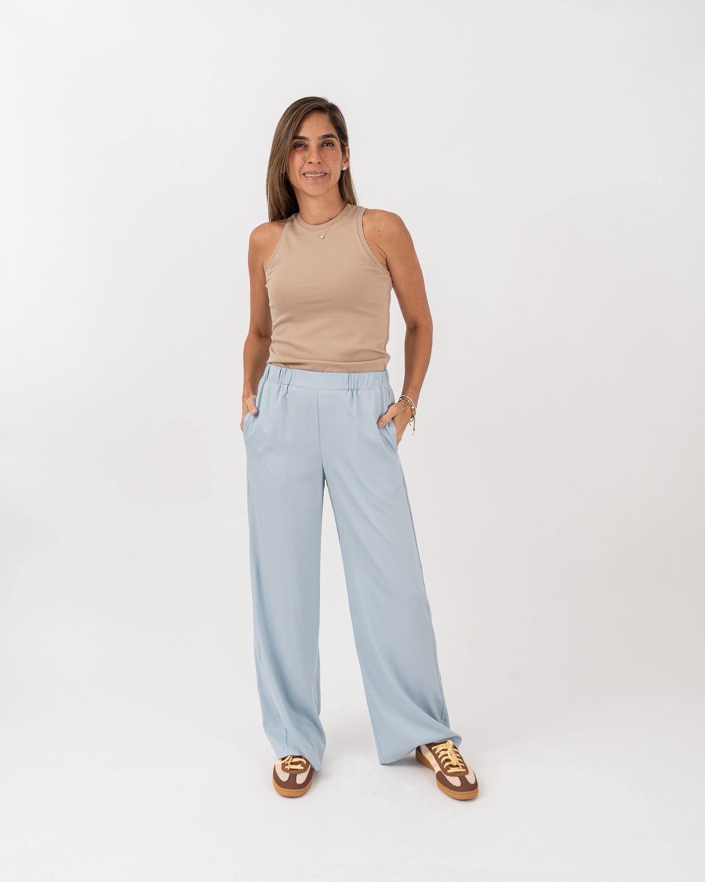 Pantalón de tiro alto con elástico pasado en contorno de cintura y bolsillos funcionales en costados.