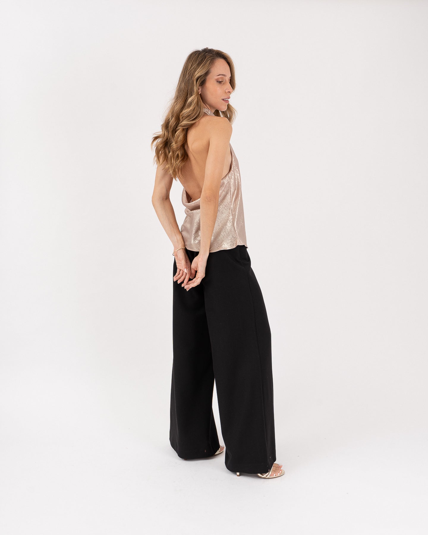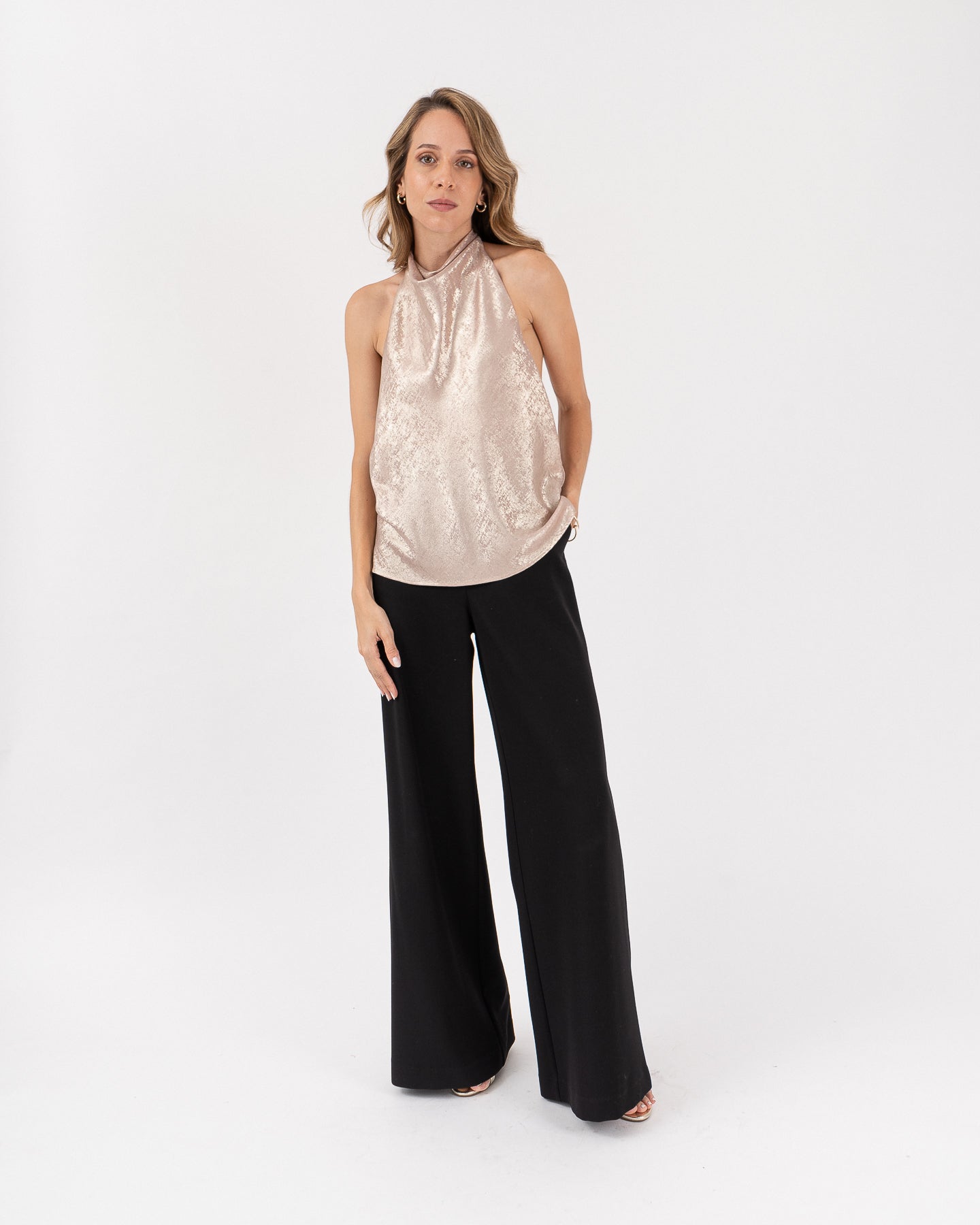 Blusa cuello halter con drapeado delantero y botones dorados en posterior, espalda descubierta.