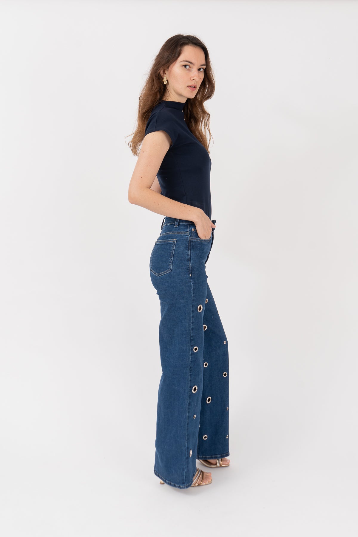 Pantalón denim bota recta 15 ojales por bota de diferentes tamaños, tela semilla