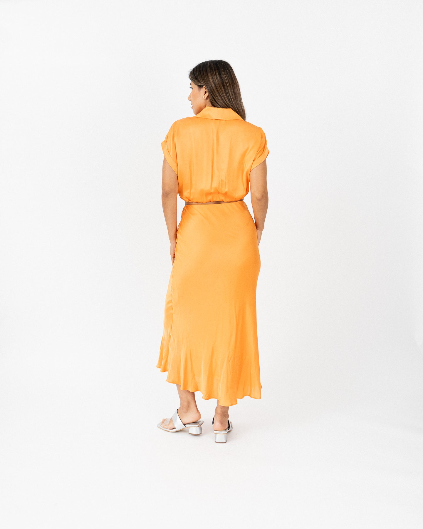 Blusa cuello camisero con escote en V manga kimona con guardapolvo. Cintura delantera con tablones y posterior con elástico.