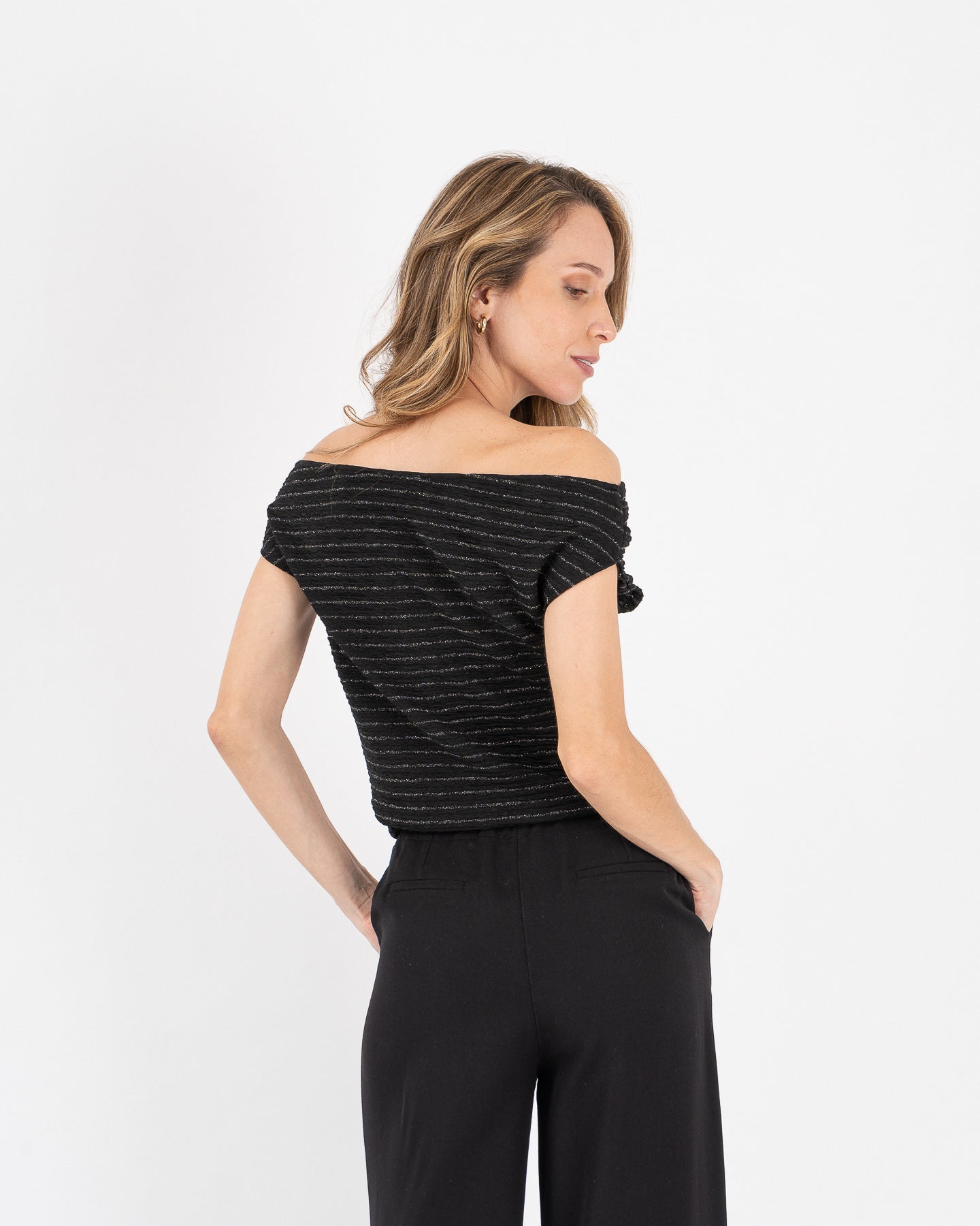 Blusa con tablones en hombros con apliques y drapeado en escotes.