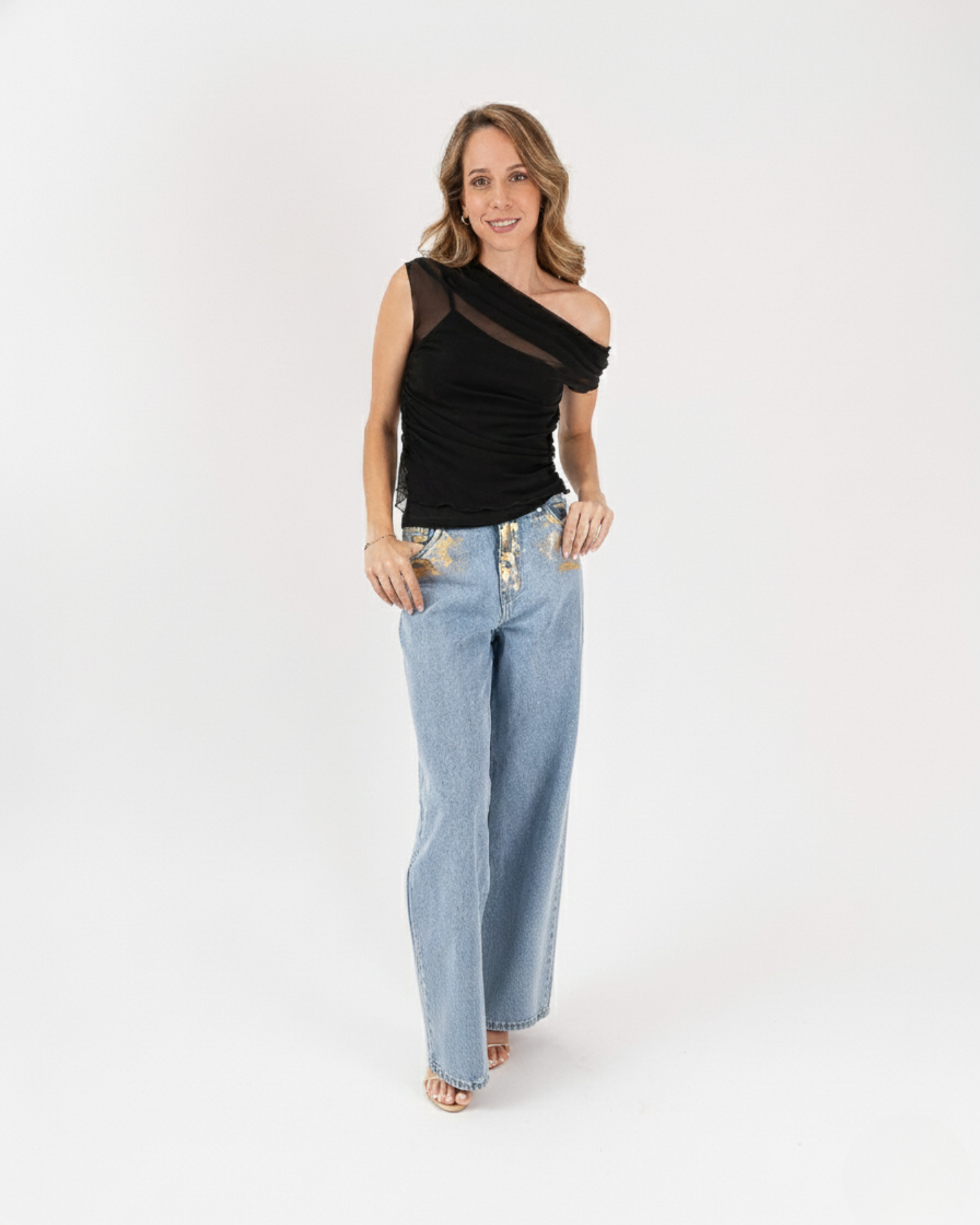 Blusa one shoulder con 2 piezas: top interno asimétrico con tirante, blusa en mesh con recogidos y drapeados en escotes y costados