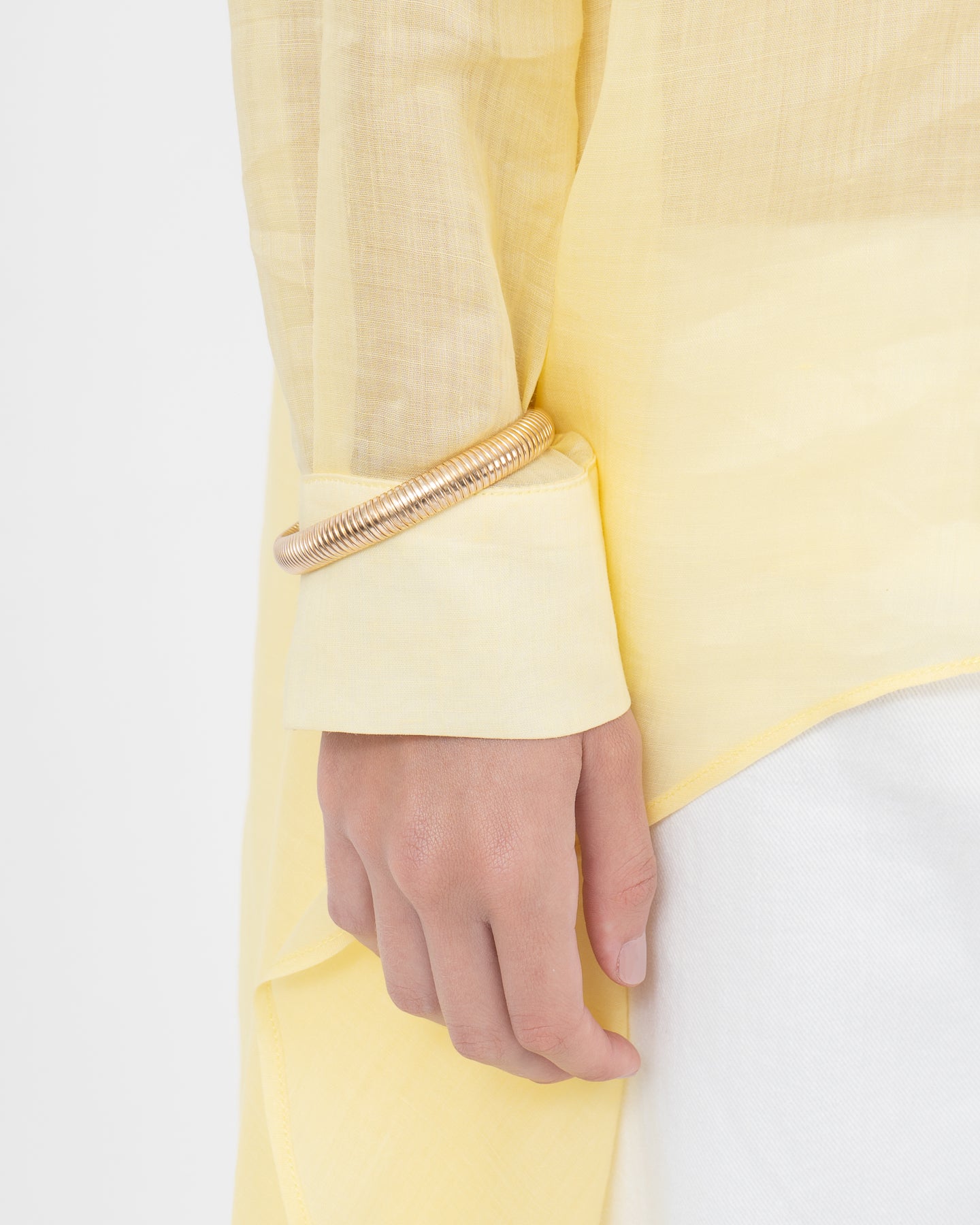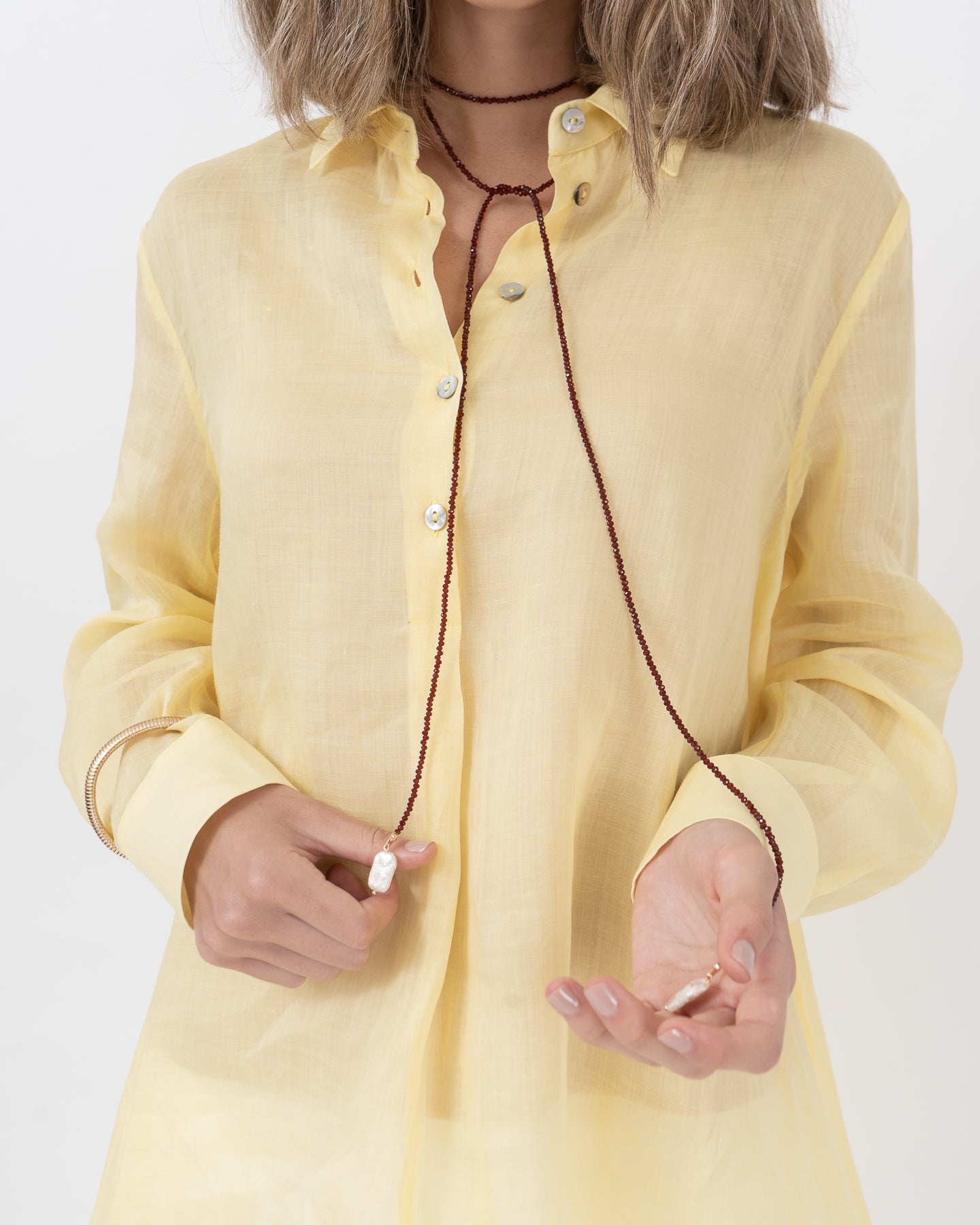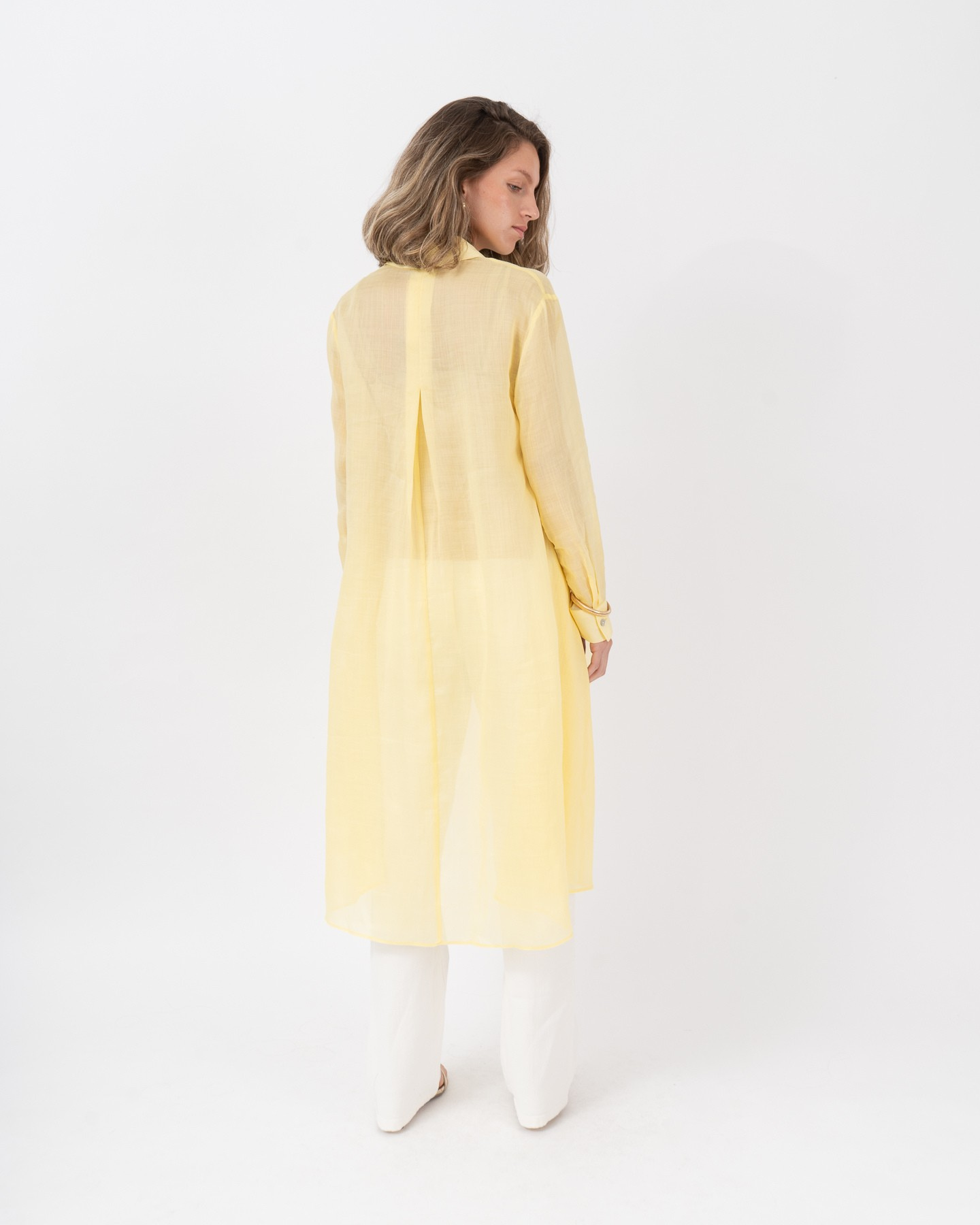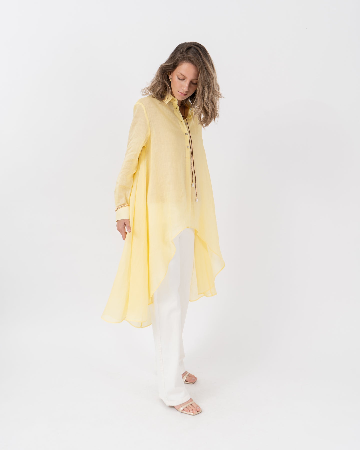 Blusa con cuello camisero mangas largas con puños funcionales, cartera tipo polo con tablón delantero. Ruedo amplio con cola en posterior.