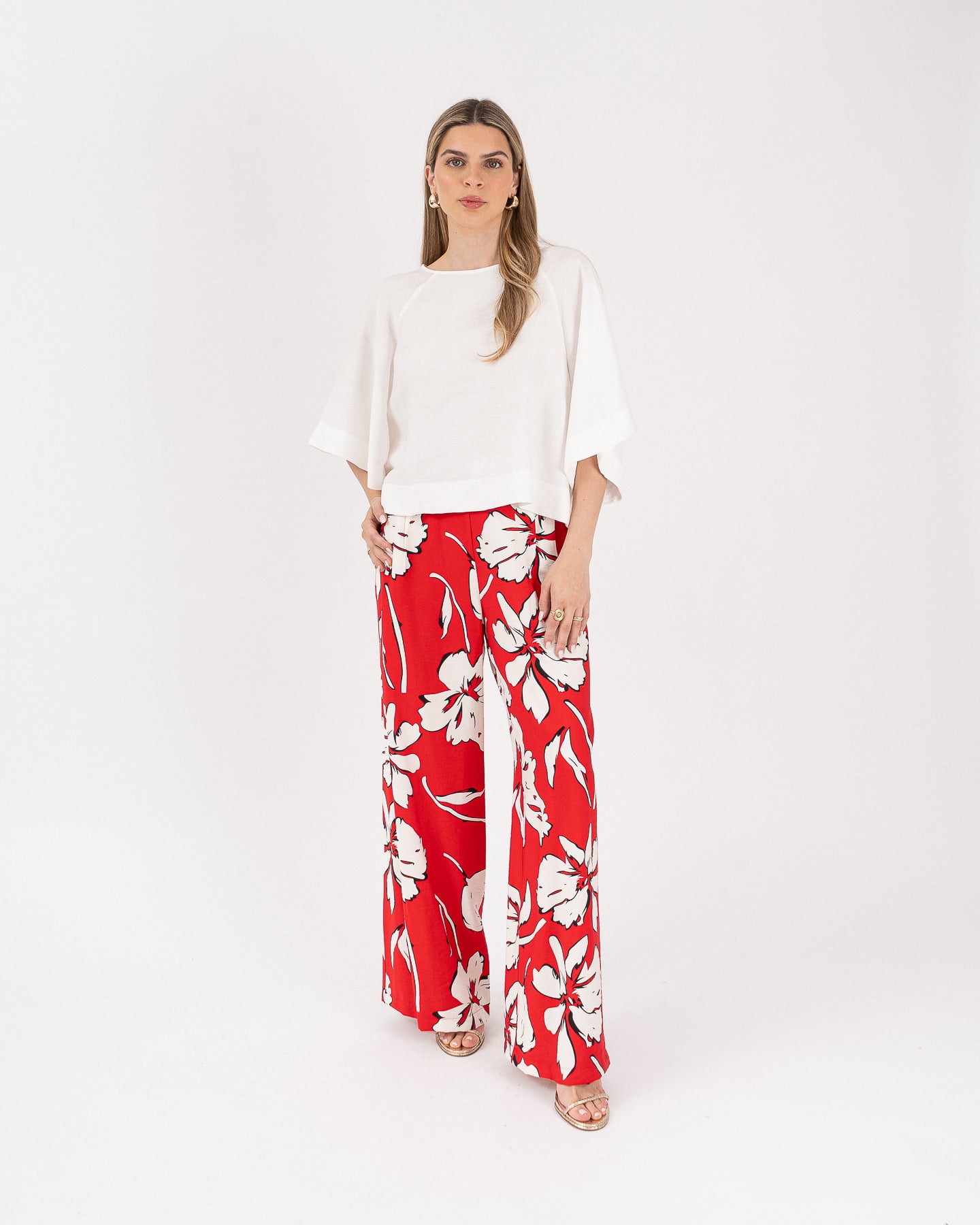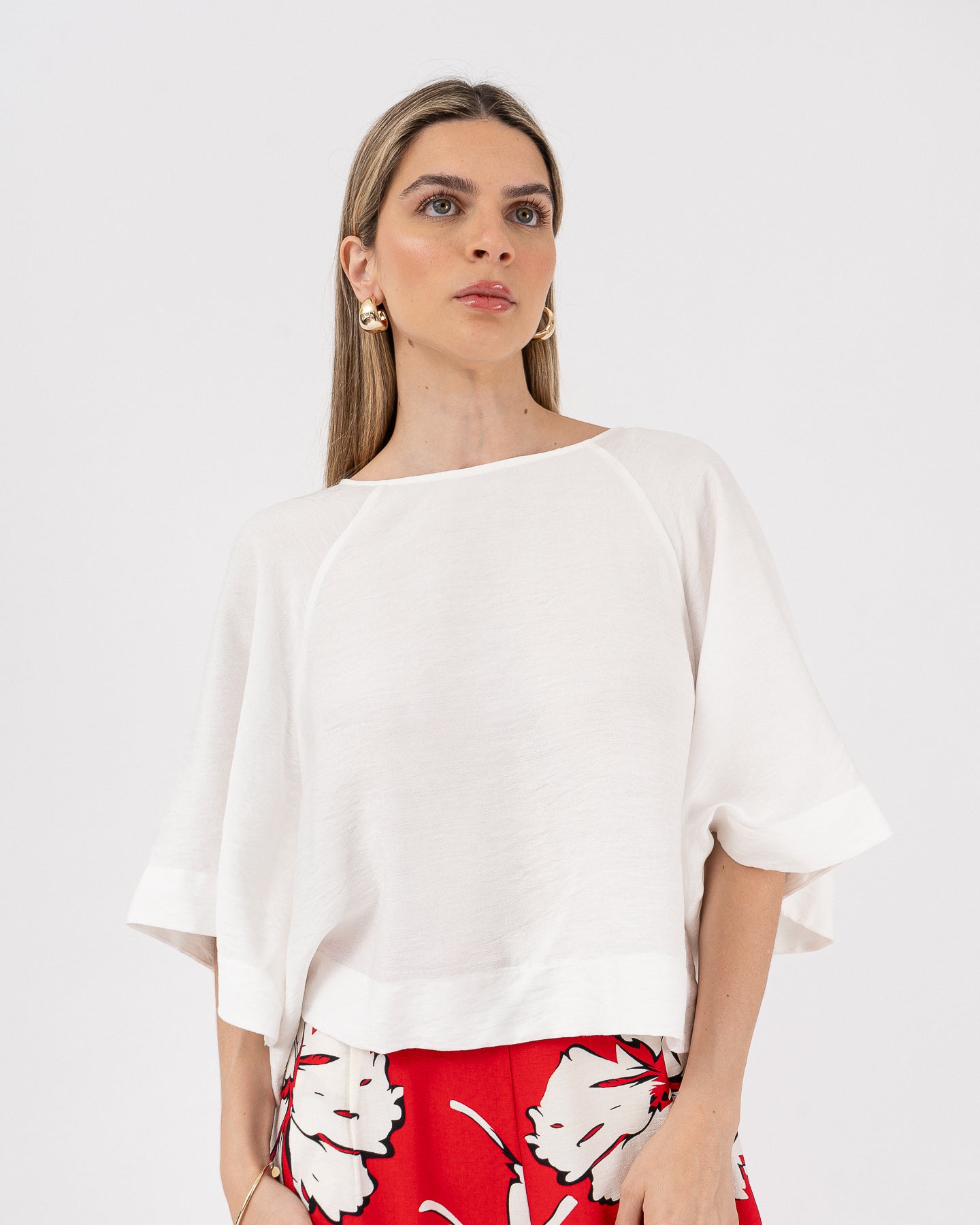 Blusa manga ranglan escote redondo con mangas semi campana, abertura posterior con tiras de amarre.