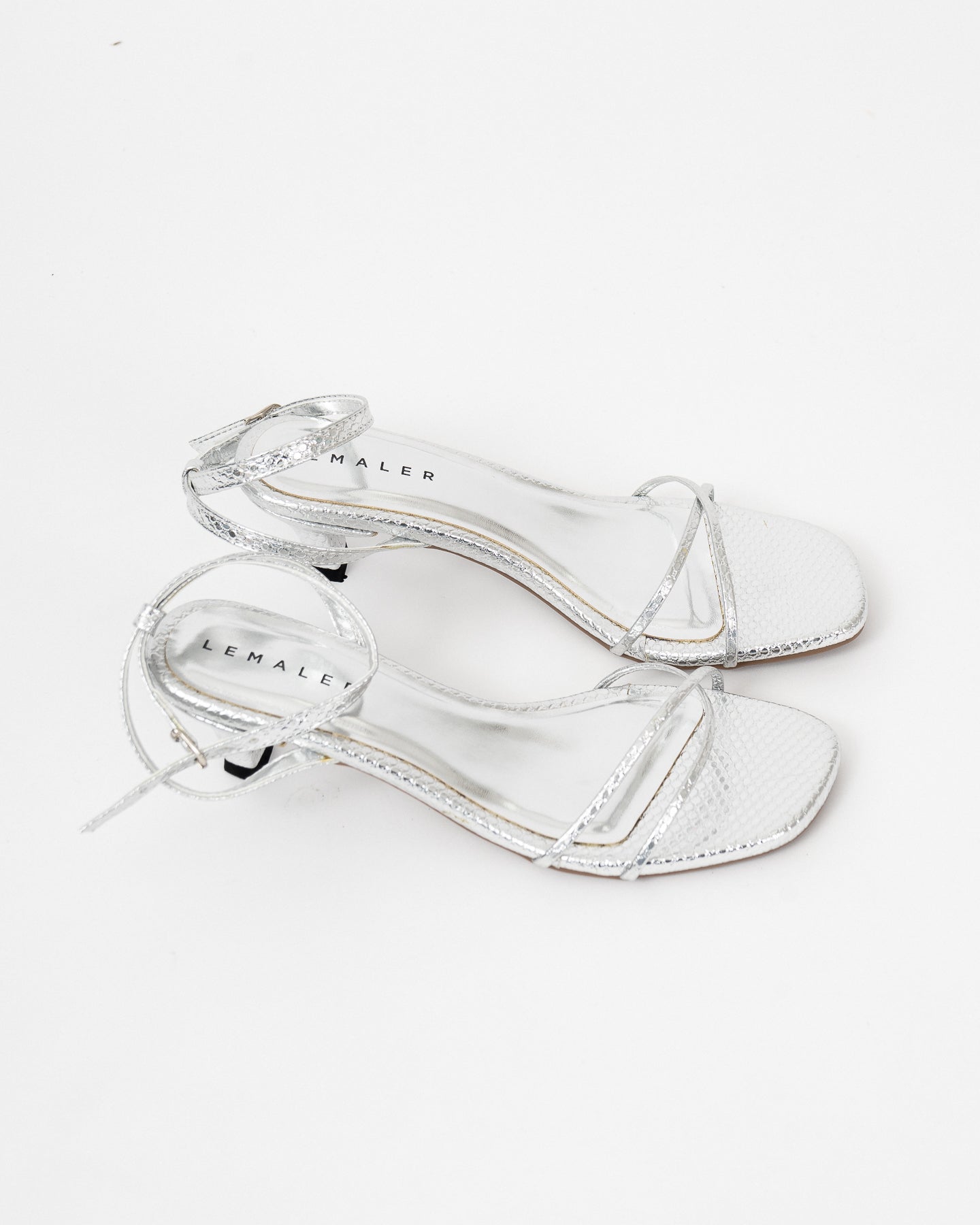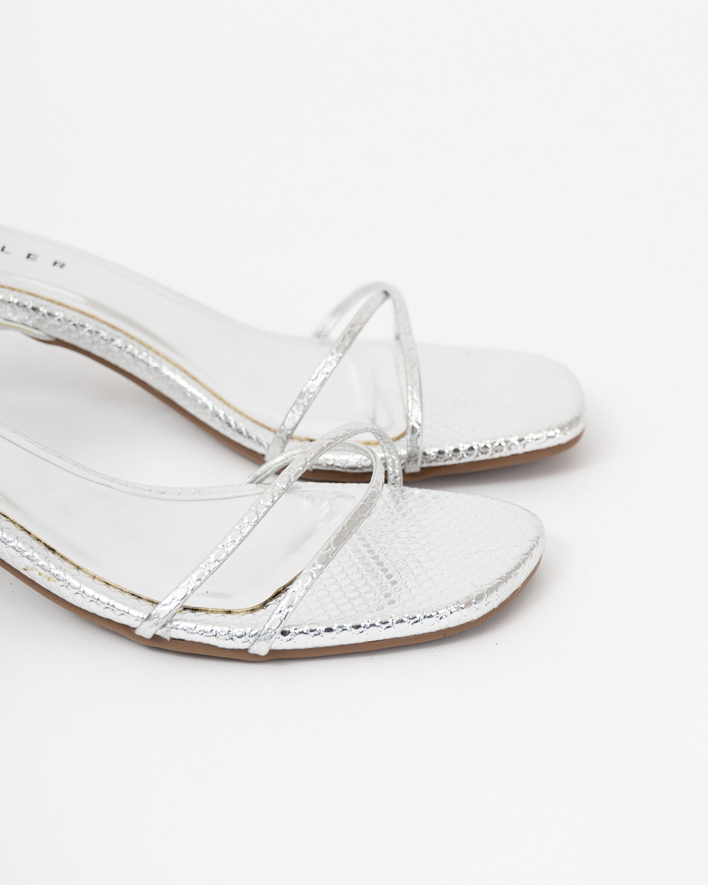 Sandalia con tacón mediano, cruce en talón y amarre con hebilla