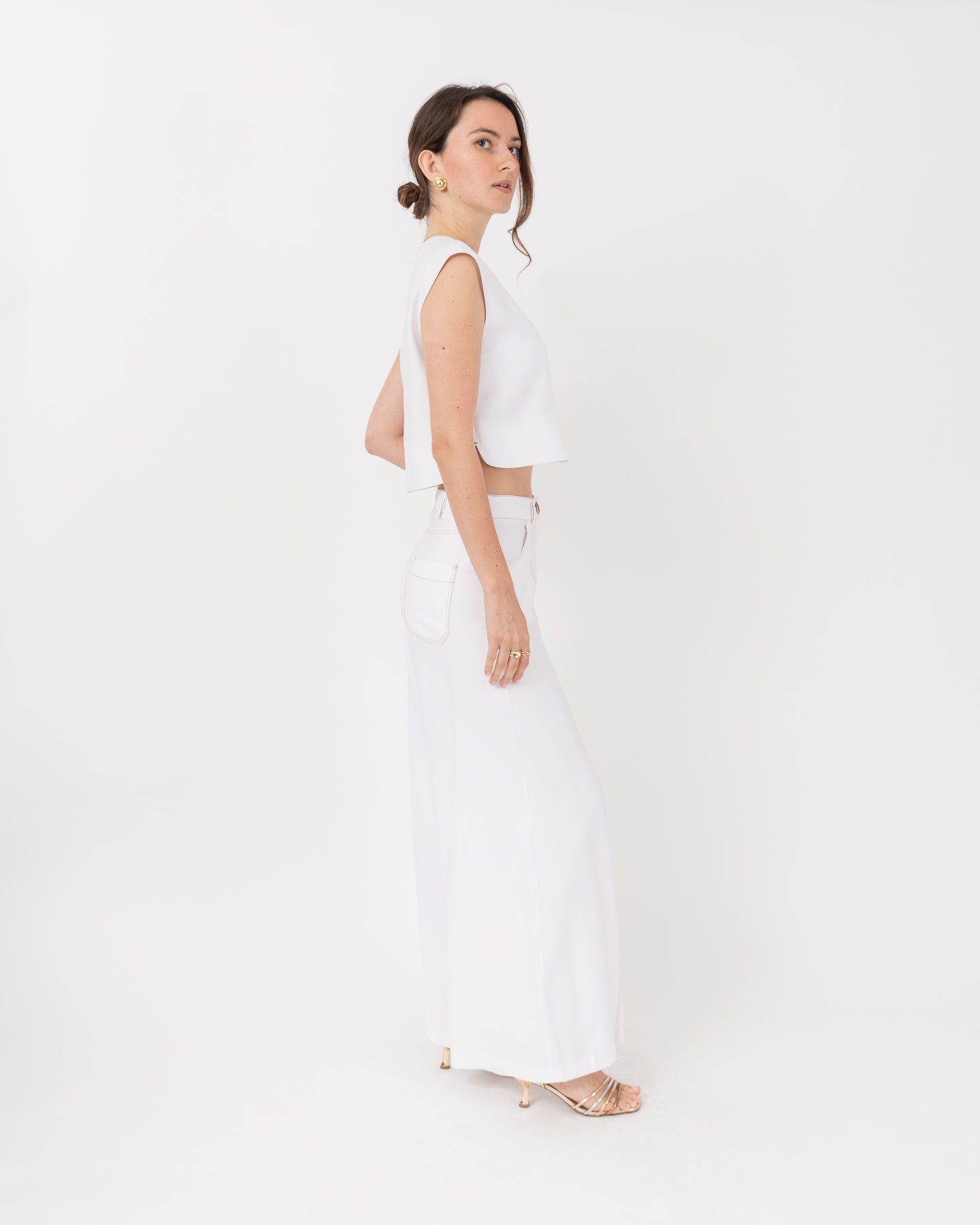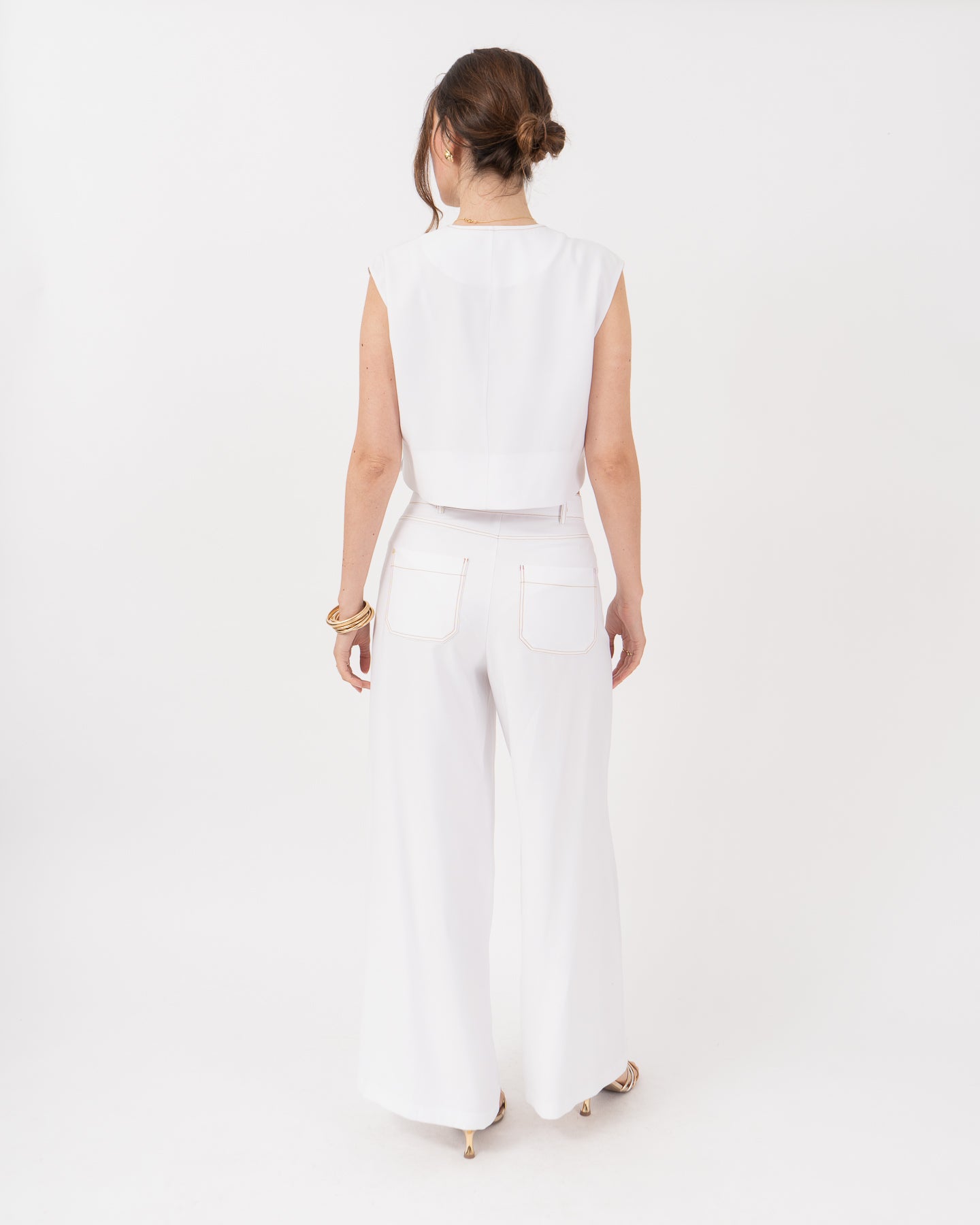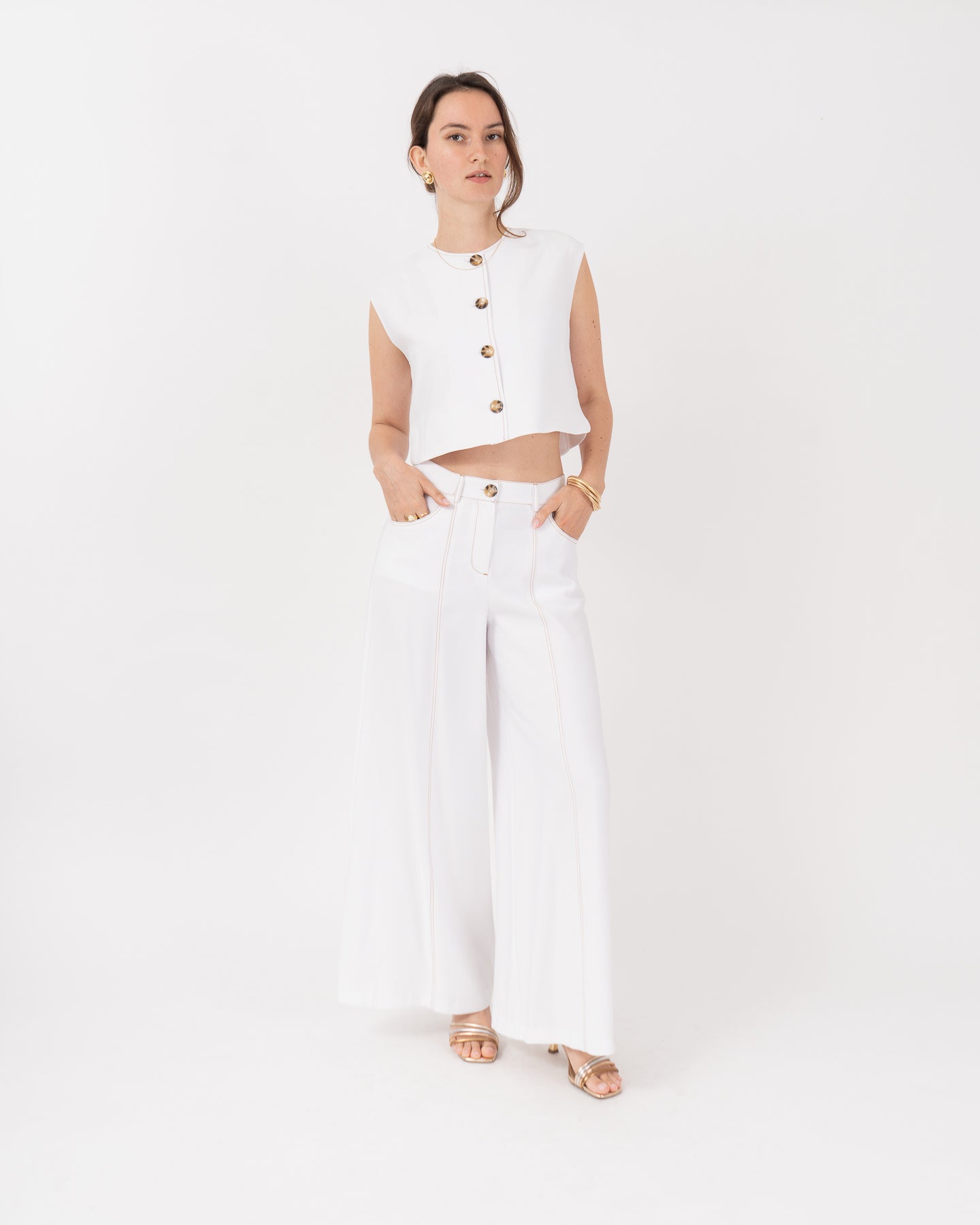Chaleco manga sisa escote redondo, ruedo curvo con aberturas detalle de costuras en contraste, botones en centro delantero