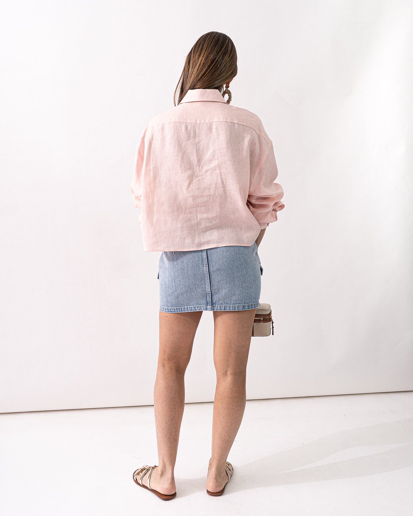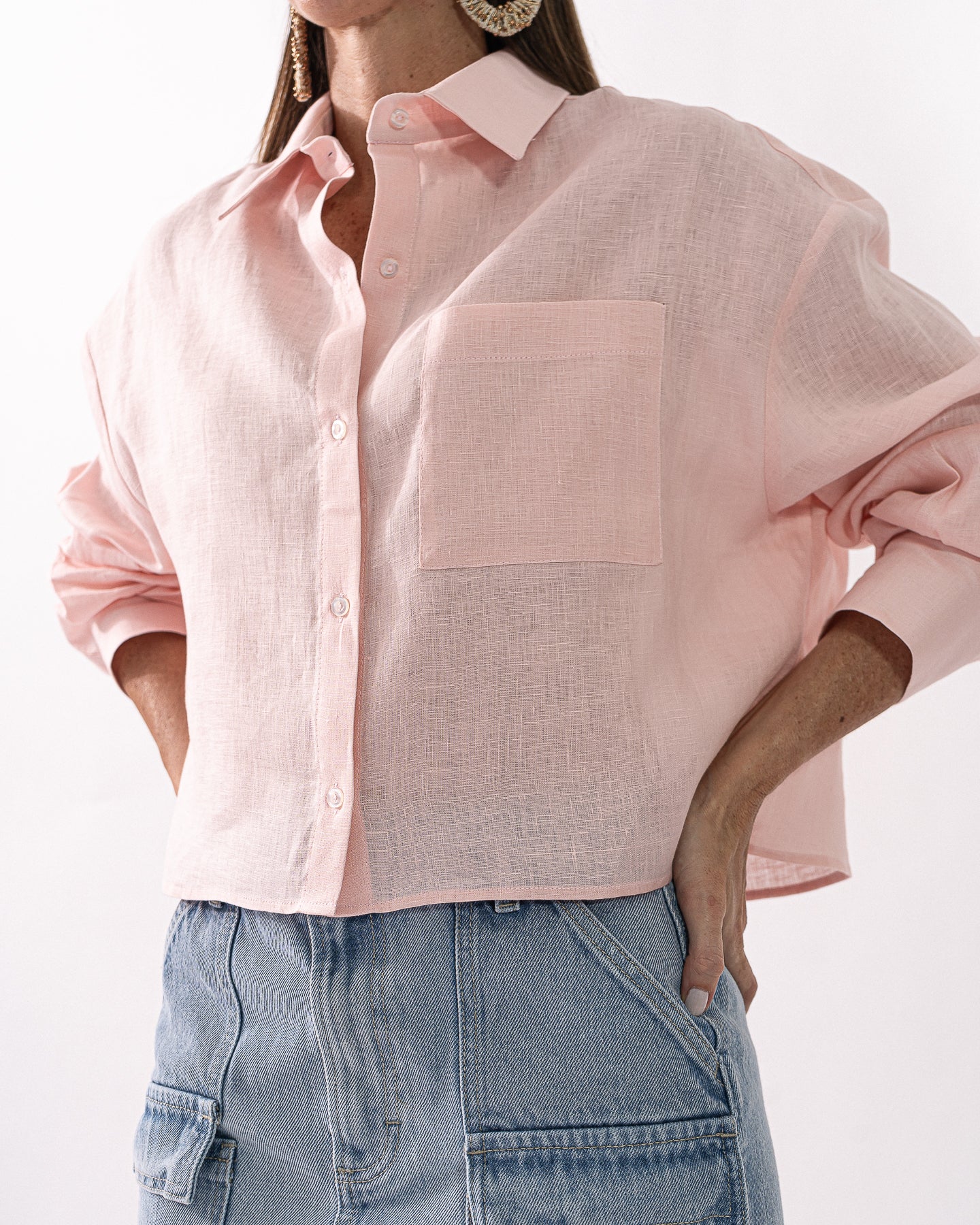 Blusa cropped en tejido de lino de cuello camisero y botones delante, mangas largas con puños abotonados y hombros caídos.