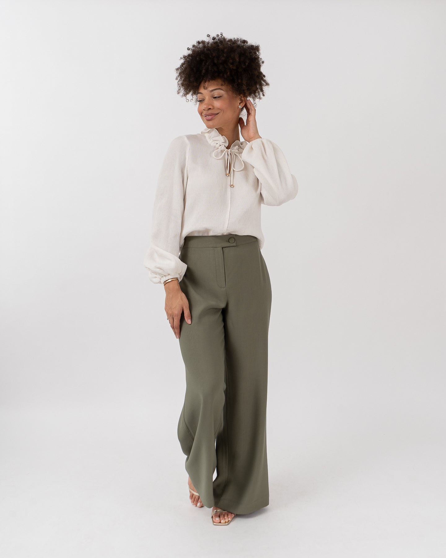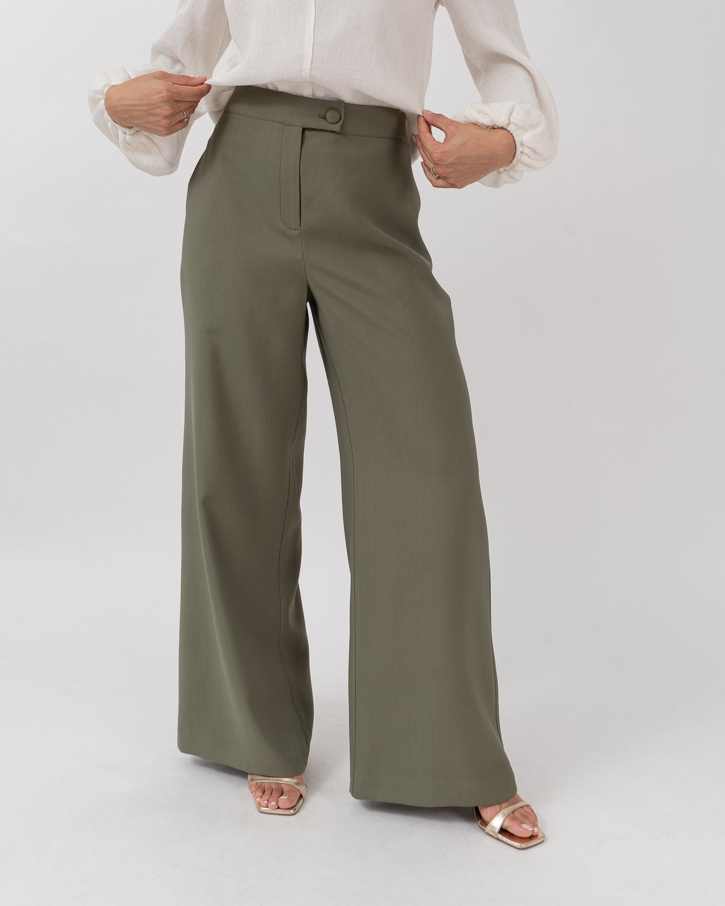 Pantalón de tiro alto con pretina cruzada y botón forrado, elástico pasado en cintura posterior.