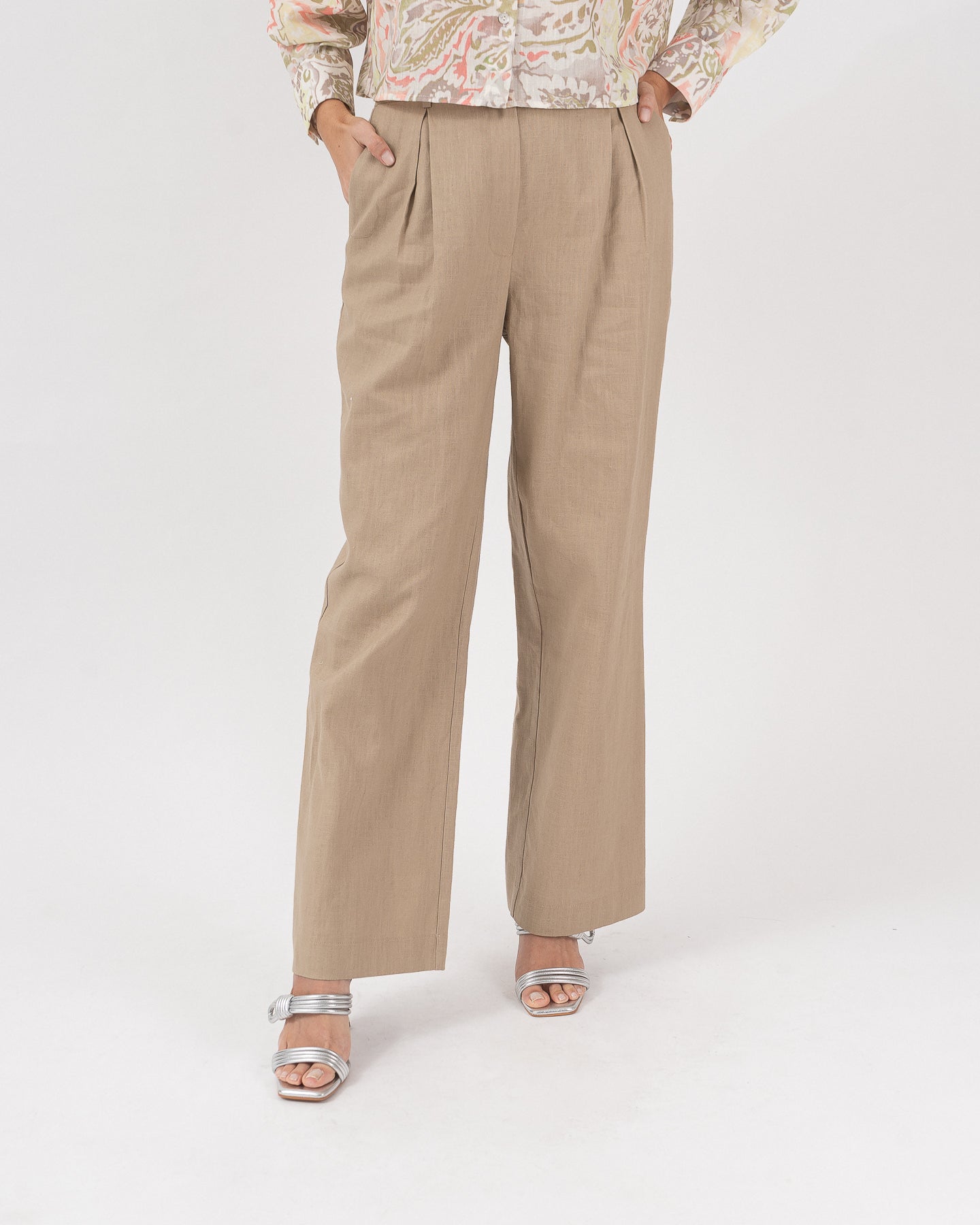 Pantalón de tiro alto con pretina y bragueta funcional, elástico pasado y pespunteado en pretina posterior, bolsillos funcionales y tablones en delantero.