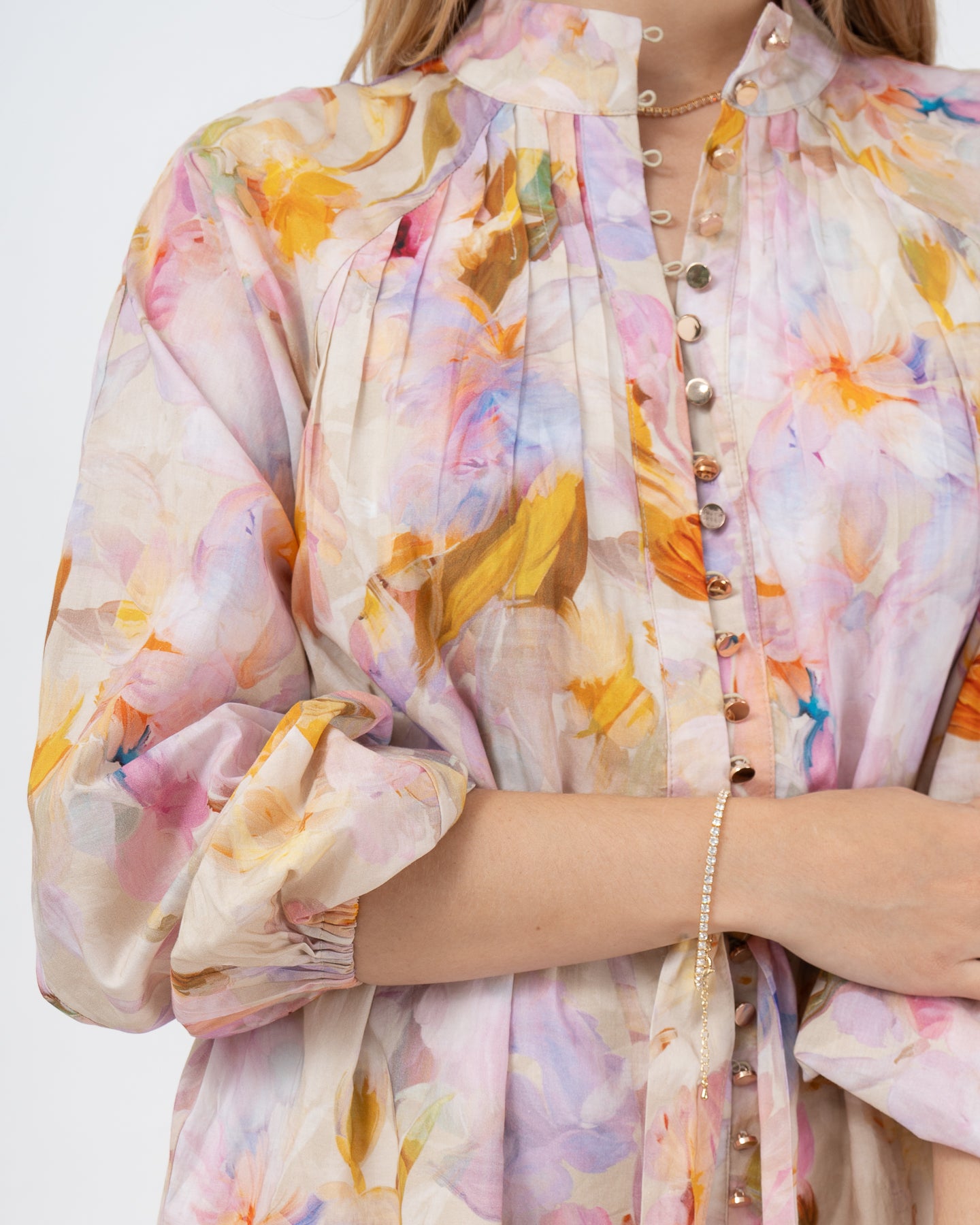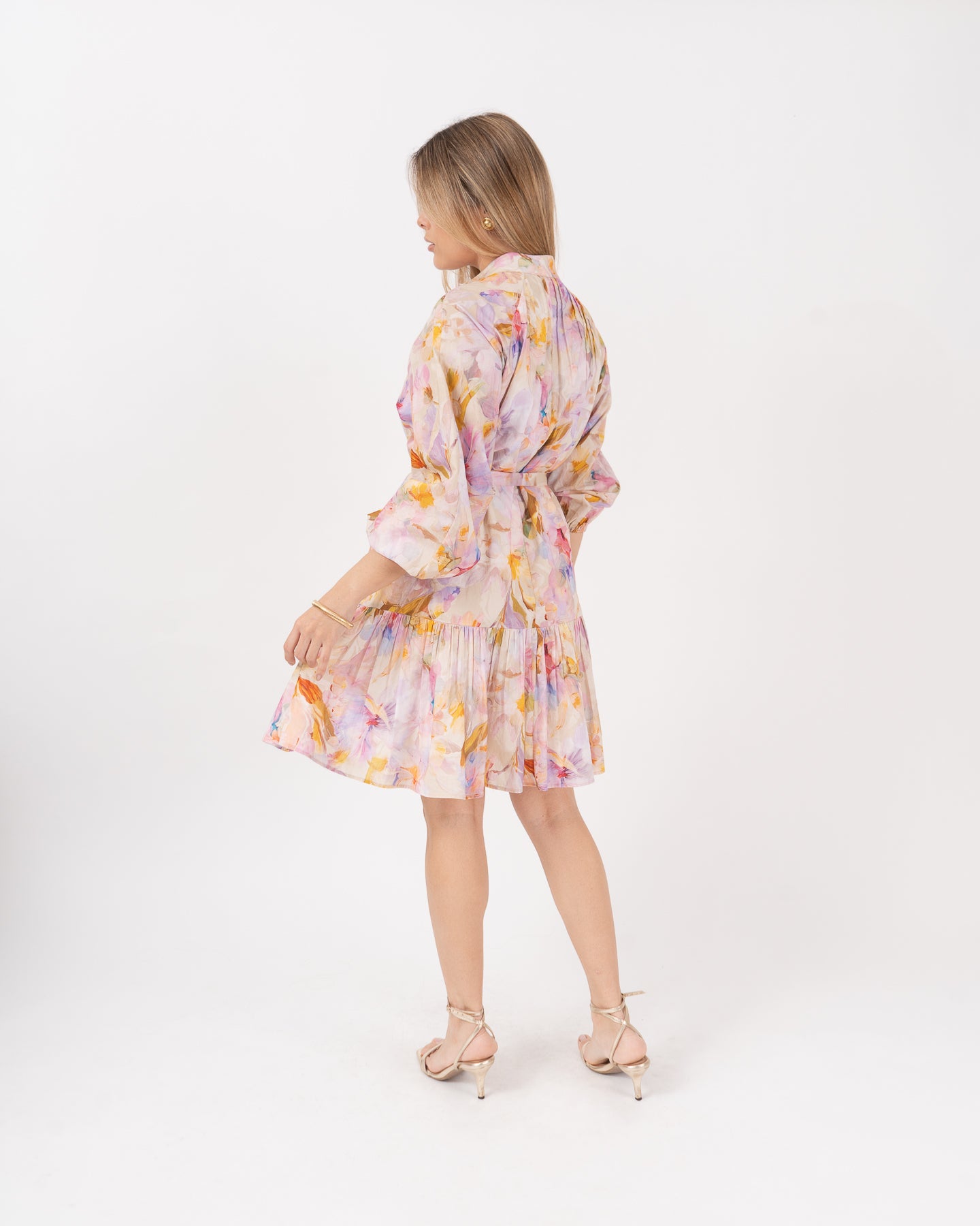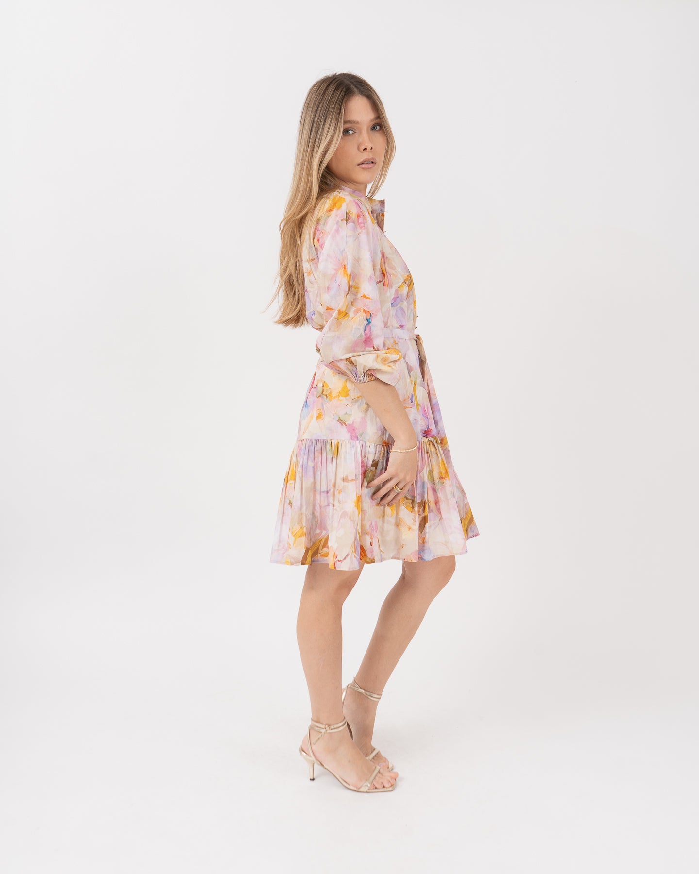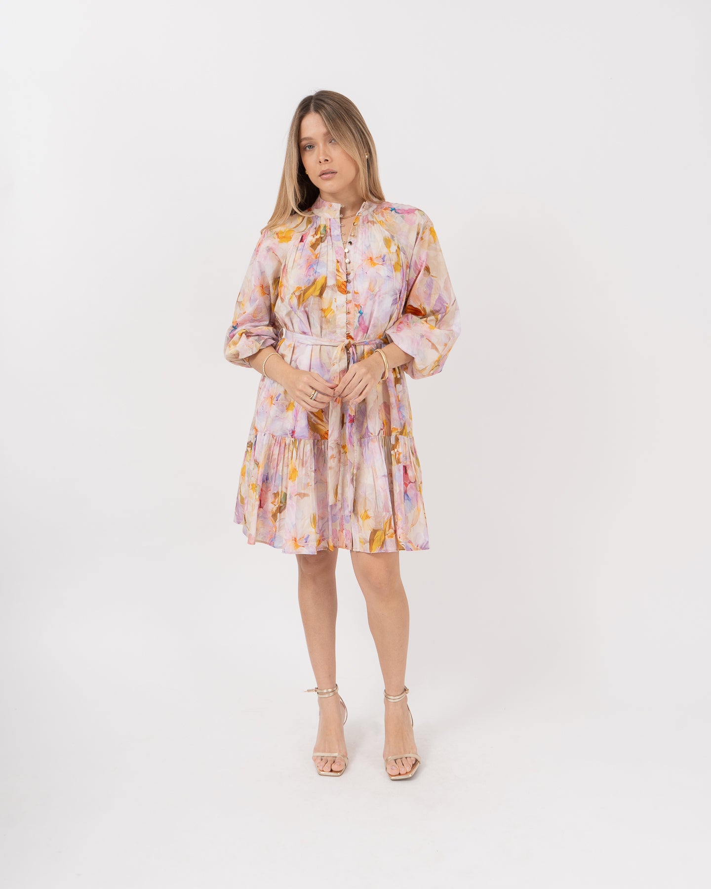 Vestido cuello nerú, manga ranglan larga bombacha con detalle de festones en escotes y sisas, cierre frontal con botones funcionales y tira de amarre de la misma tela.
